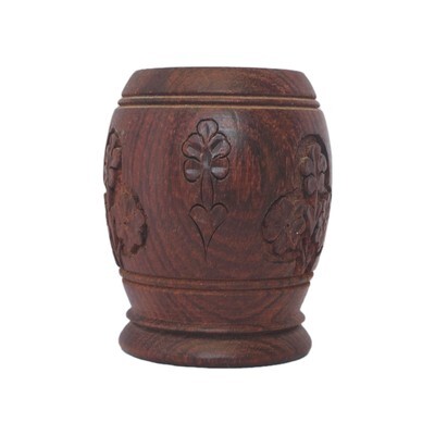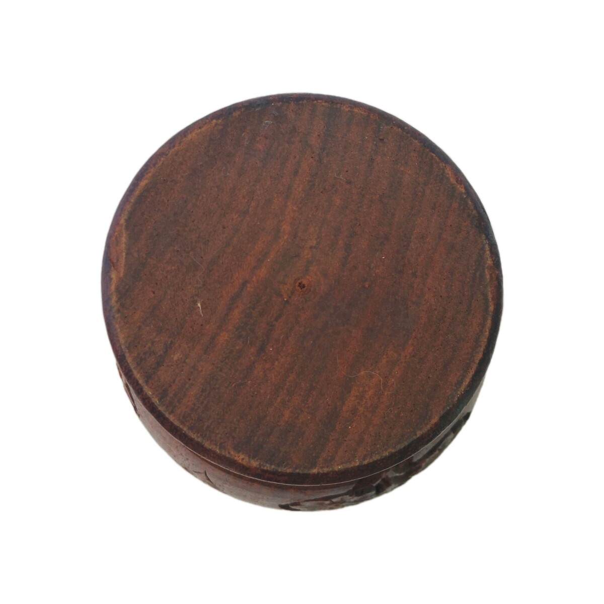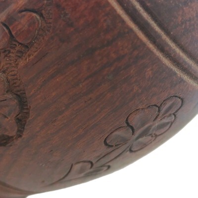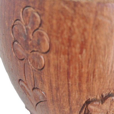 .This vintage hand-carved wooden vessel features intricate floral designs, perfect for adding a touch of retro charm to any space. Measuring 4 inches in height, this walnut-colored vase or planter is ideal for displaying small flowers or herbs, or simply as a decorative accent. Handmade with a unique design, this piece showcases the craftsmanship of the 1970s era, adding a timeless element to your home decor.