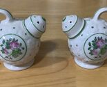 Set of porcelain tea pot salt and pepper shakers. Hand painted in Japan. The spouts unscrew for filling. 2 1/2 inches tall wide. White with painted green accents and lavender flowers on one side. No chips, paint is slightly rubbed in a few spots. Maker isn?t stated, but there is a trade mark on the bottom. Overall good condition. Feel free to email with questions. I do combine shipping on multiple orders. Have a great day!