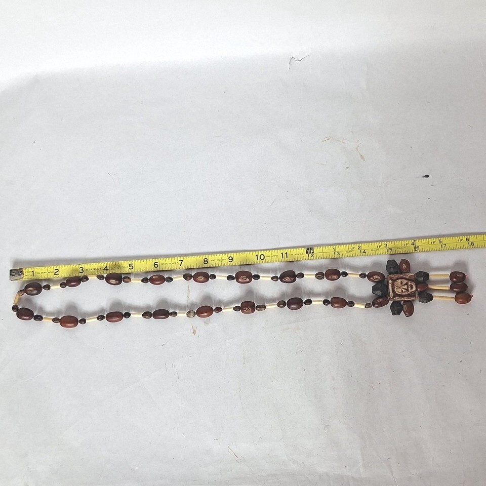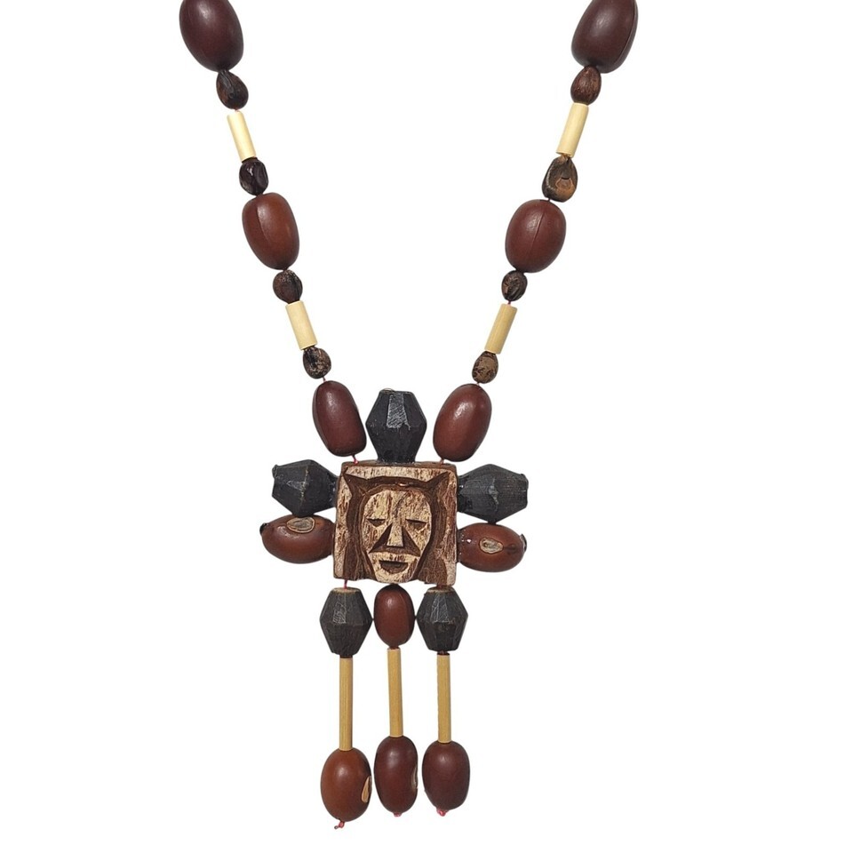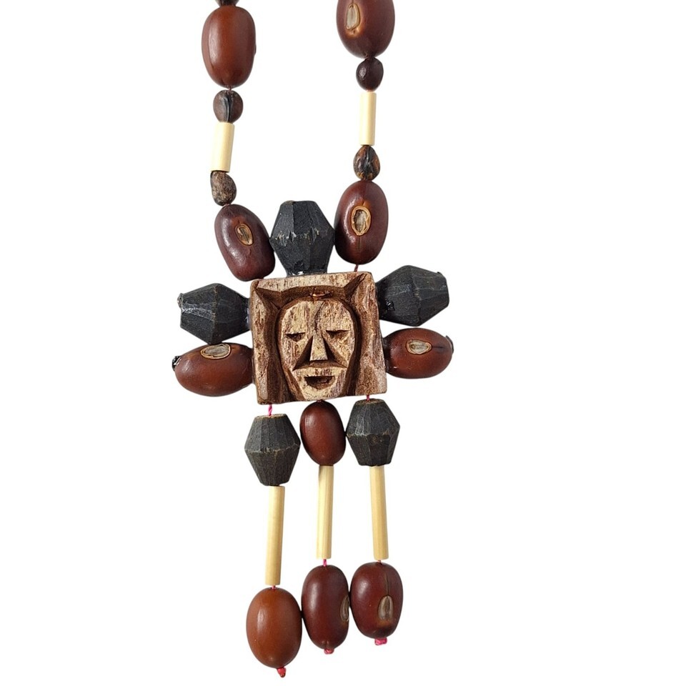 - Vtg Handcrafted Tribal Necklace Carved Face Pendant Beads Ethnic Boho Jewelry