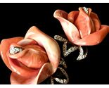 Beautiful pair of vintage enamel faux coral clip earrings by designer Kenneth Jay Lane. Roses made from orange-pink lucite are accented with black enamel and clear rhinestones in gold plated settings. The earrings are each about 1.25" x 1", with secure, padded clip backs. Stamped KJL on the backs. Absolutely mint, seem never worn.
