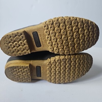 These vintage LL Bean Duck Boots in mens size 8M and womens 9.5/10 are a classic addition to any wardrobe. Made in the USA, these ankle boots feature a solid brown color with a round toe and lace-up closure. The waterproof rubber outsole and upper material of rubber and leather make them perfect for casual winter occasions. The iconic L.L. Bean brand and USA theme add a touch of Americana to your look, while the sturdy construction ensures long-lasting wear.