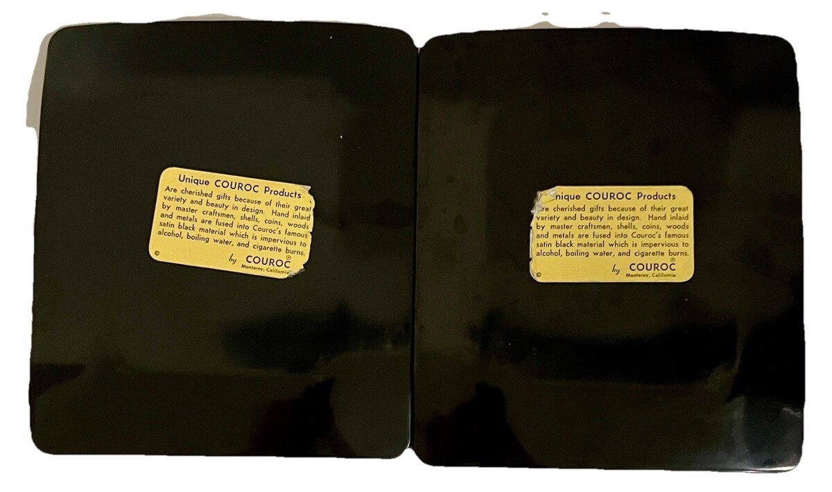 This product is a set of 6 vintage Couroc serving plates trays from the 1960s. Made of acrylic material, these rectangular trays feature various inlays in a multicolor design. With a medium size and a width of 7 inches, these trays are perfect for all occasions and add a touch of retro style to any kitchen or dining table. Each tray is a collectible piece that showcases the unique design and craftsmanship of the MCM Couroc brand.