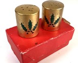 - Vtg Macys Christmas Xmas Metal Salt and Pepper Shakers Holly Leaf w/Orig Box