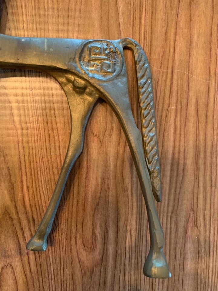 This vintage Mid Century Modern Bronze Etruscan Horse Sculpture is a large and striking piece, standing at 10.5 inches tall and 7.5 inches long.