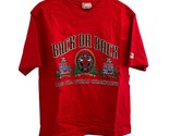 This is a brand new vintage from 1992 embroidered Nutmeg brand t-shirt featuring the Chicago Bulls, the NBA team for which Michael Jordan played. The shirt commemorates the Bulls' back-to-back championships in 1992, with the design showcasing team pride. As an officially licensed product, it is made in the United States and sized as a large for men. The shirt is RED in color and is a great addition for any fan of the Chicago Bulls or basketball in general. This is an amazing find especially because it is brand new from over 33 years ago!
