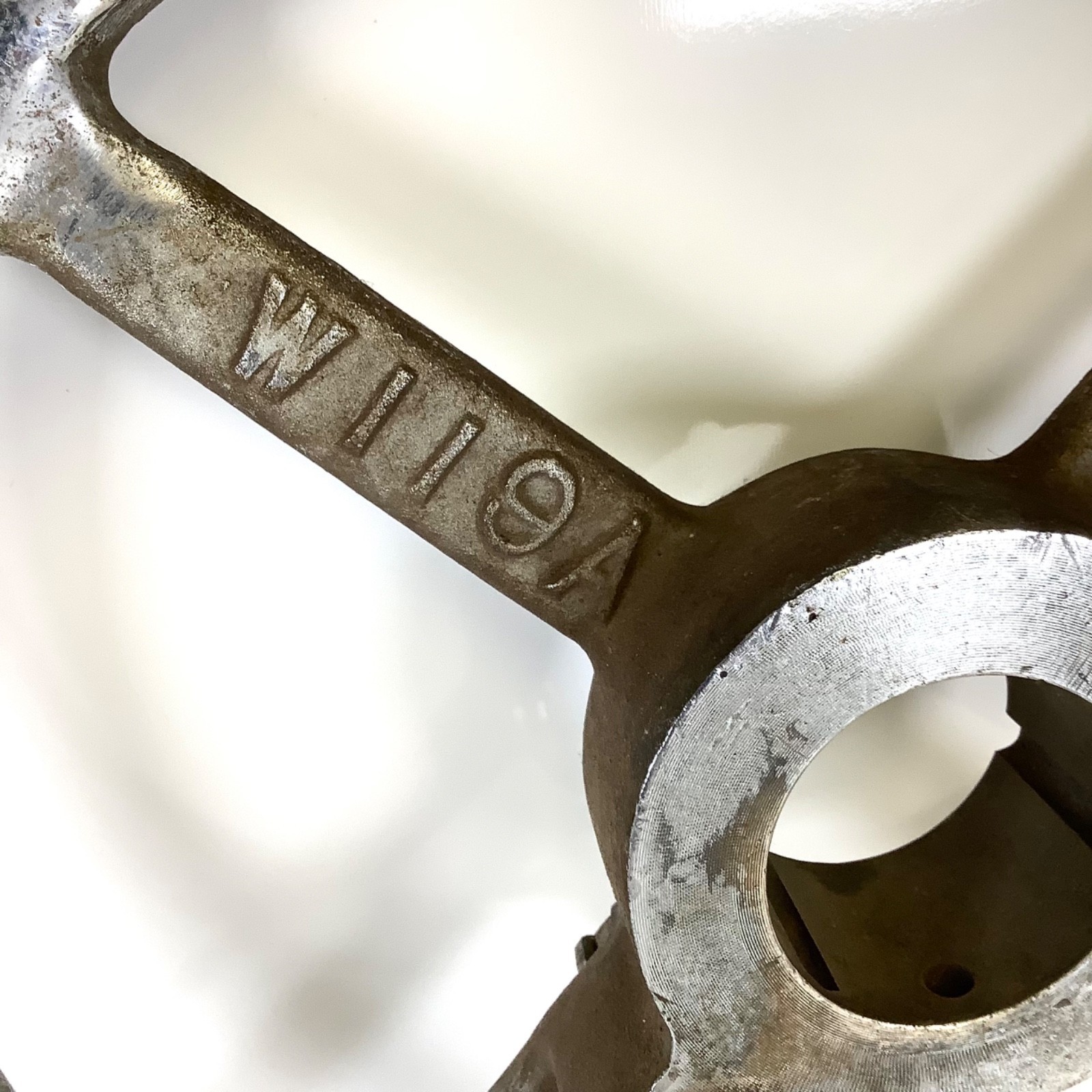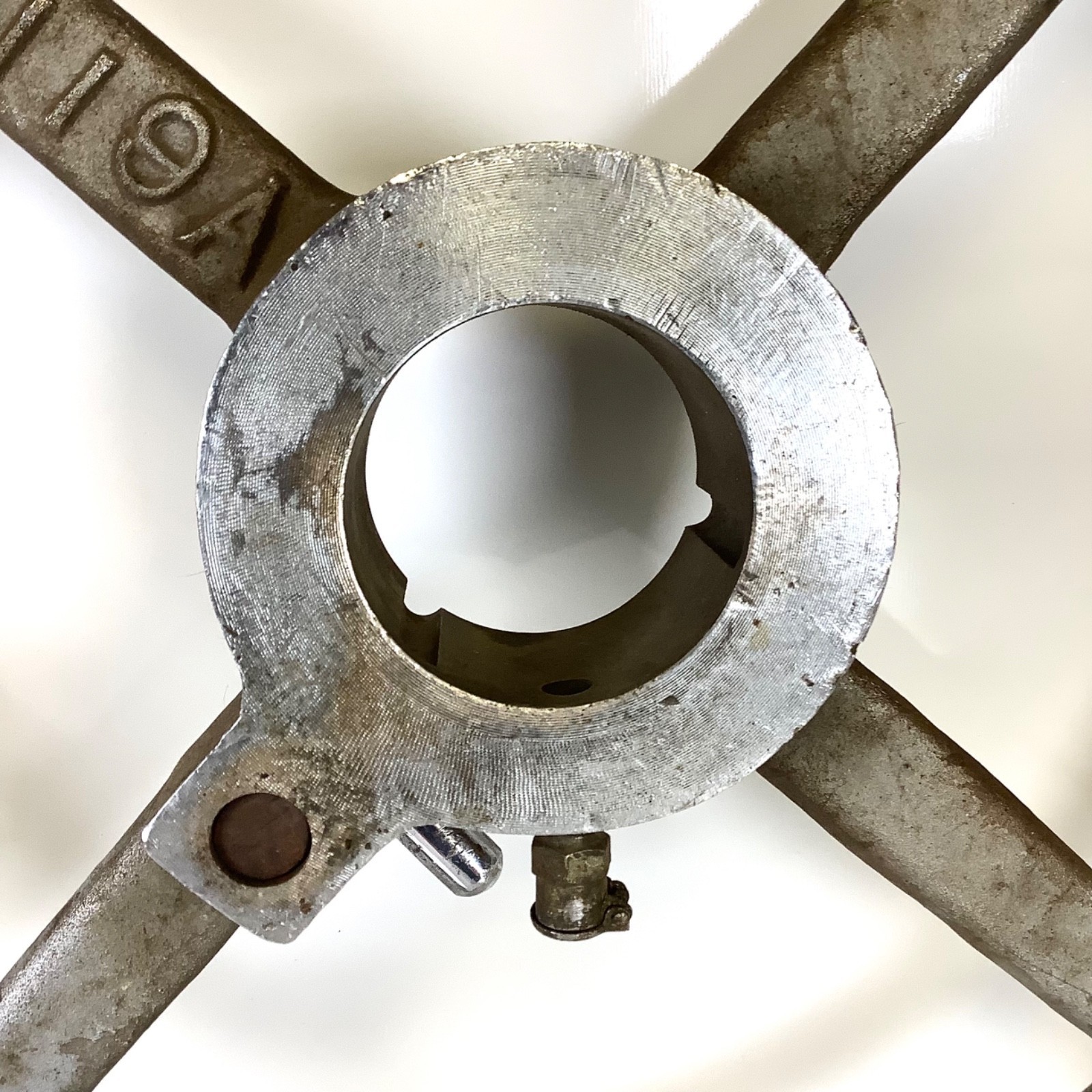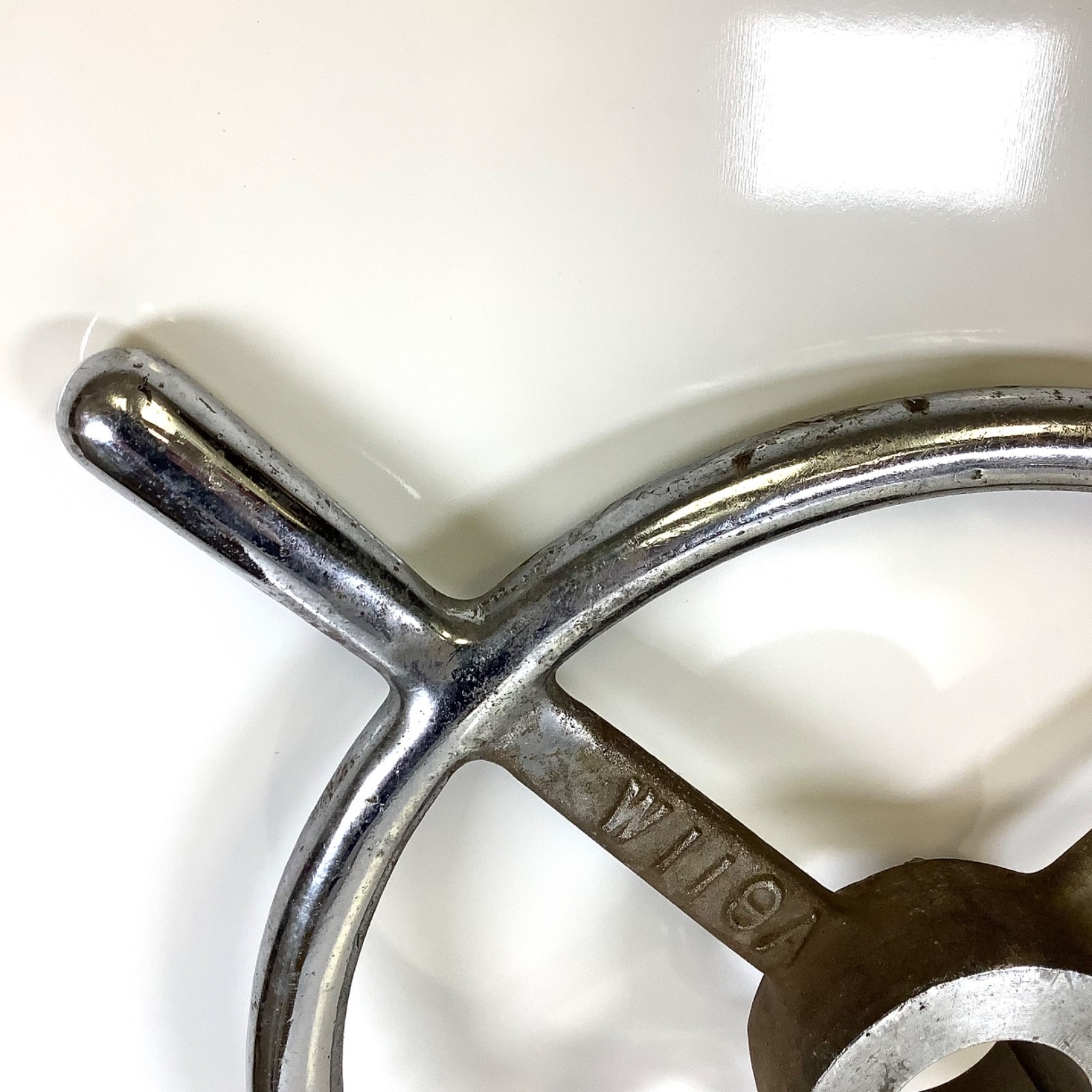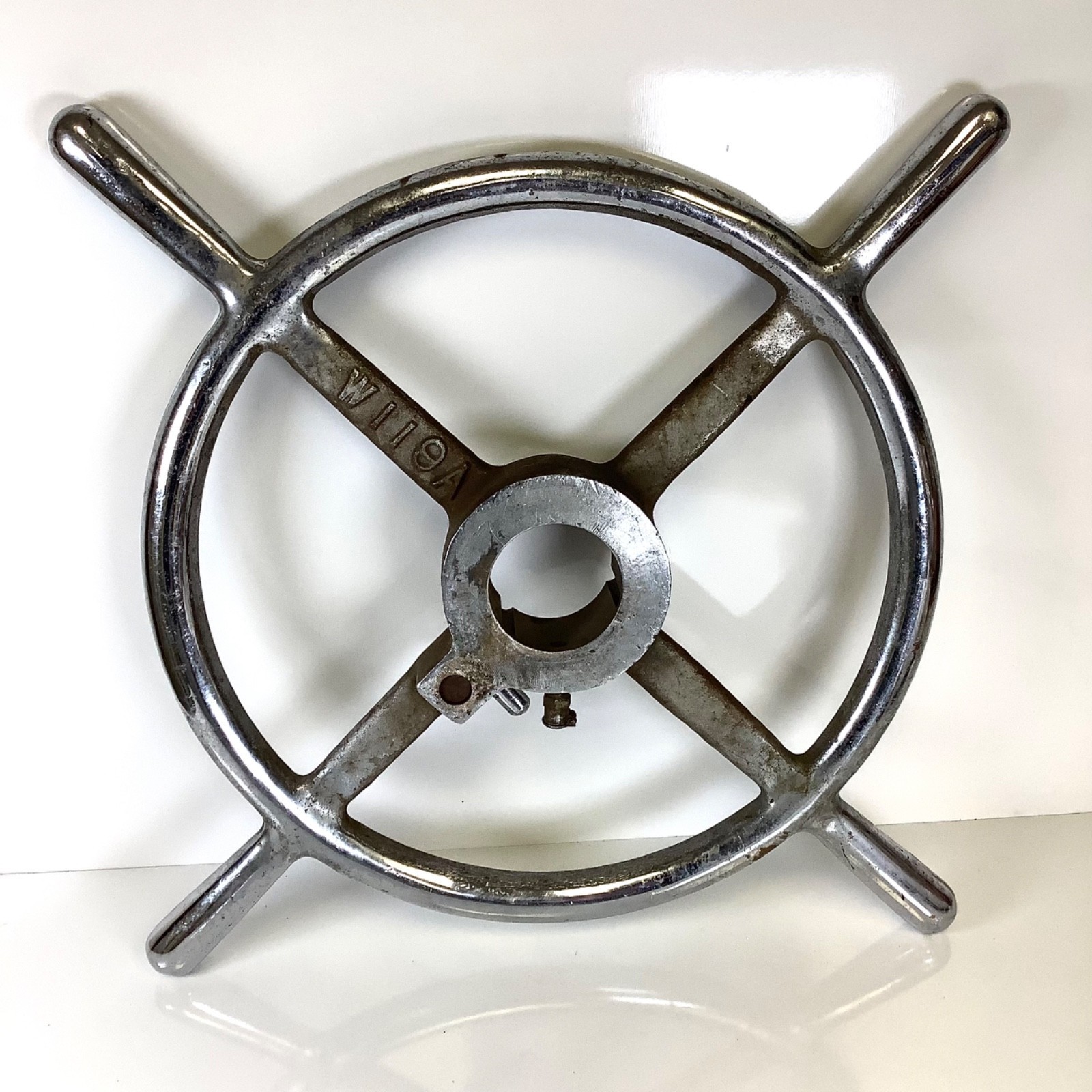 Vintage Nautical Boat Steering or Hatch Wheel 4-Spoke Stainless Steel Heavy. Shows some wear but overall solid condition. Measures approximately 23.5 inches from end of handle to end of handle diameter. The ring is approximately 15 inches in diameter. The opening of the shaft is approximately 2.5 inches in diameter. Marked W119A. This is a heavy piece and weighs over 26 pounds. Please see all photos.