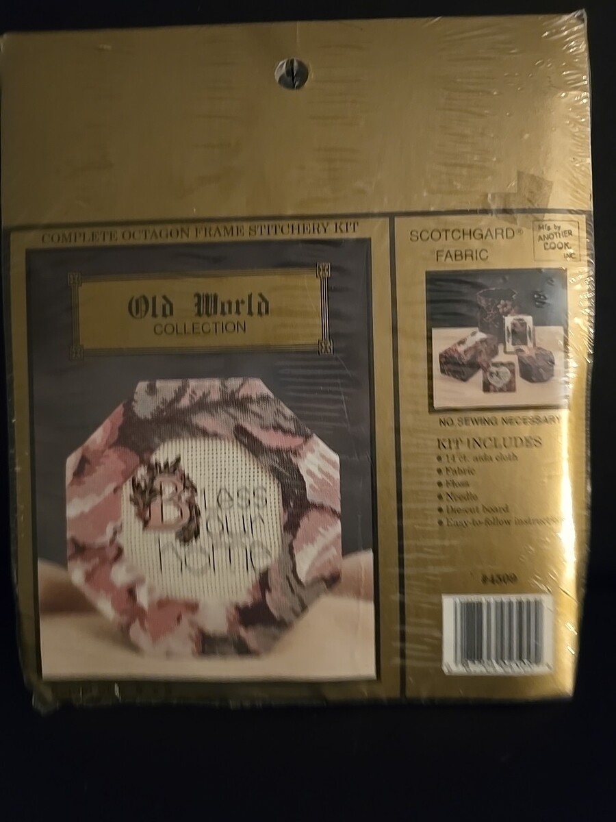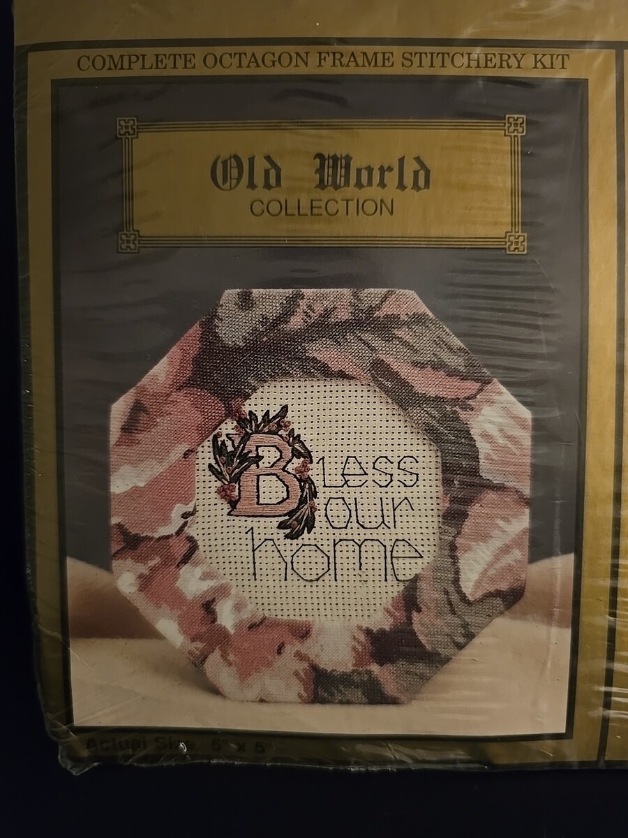 - Vtg Old World Collection Cross Stitch Kit Floral Bless Our Home Octagon