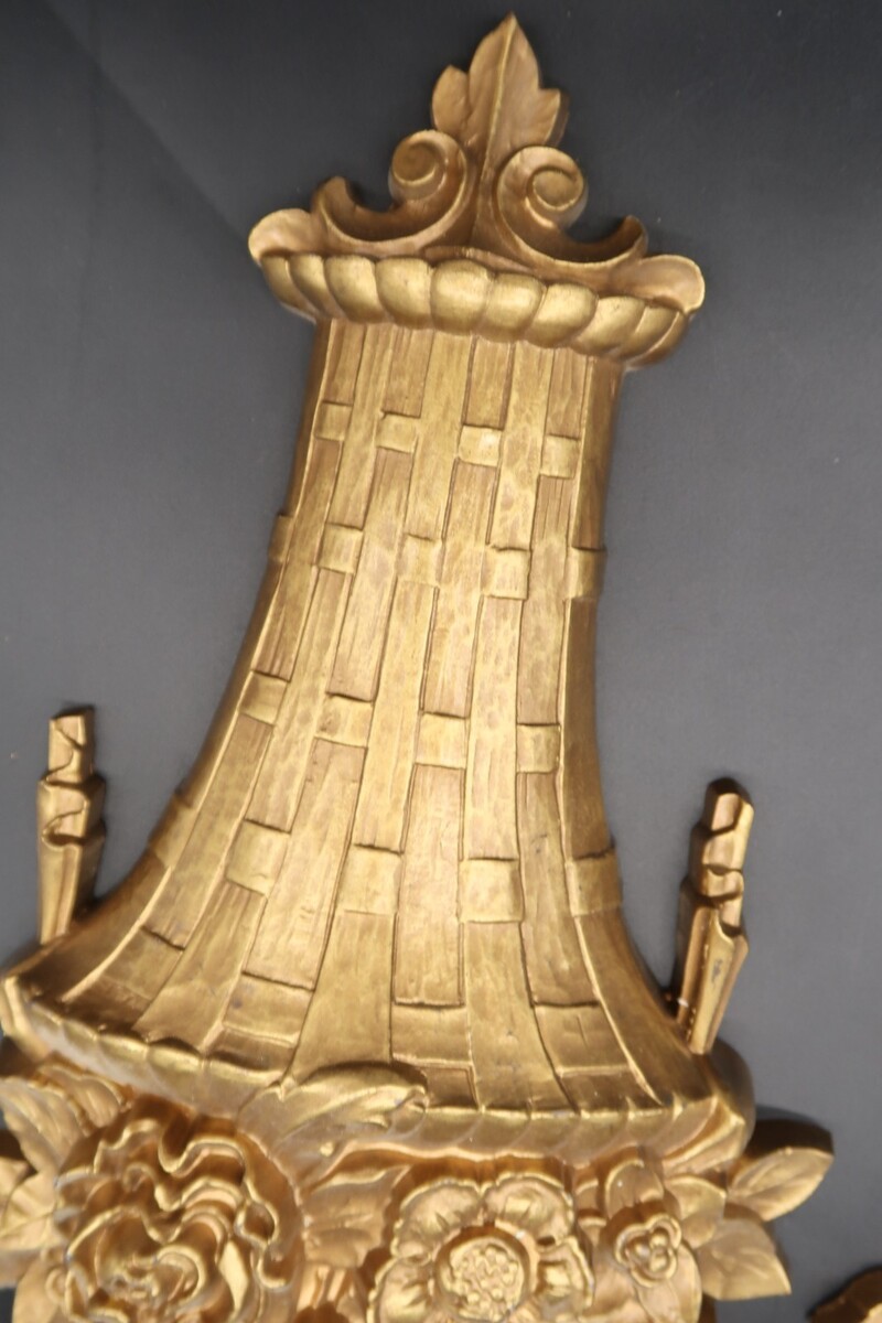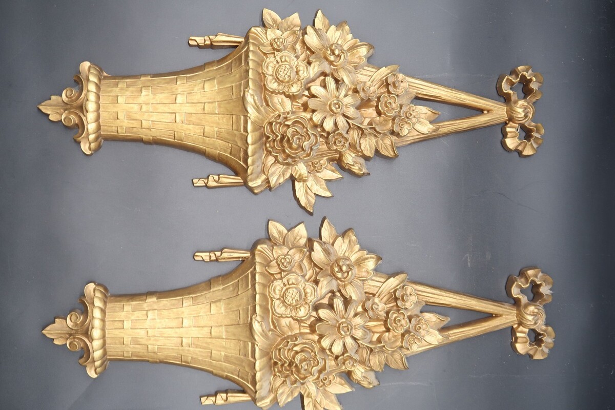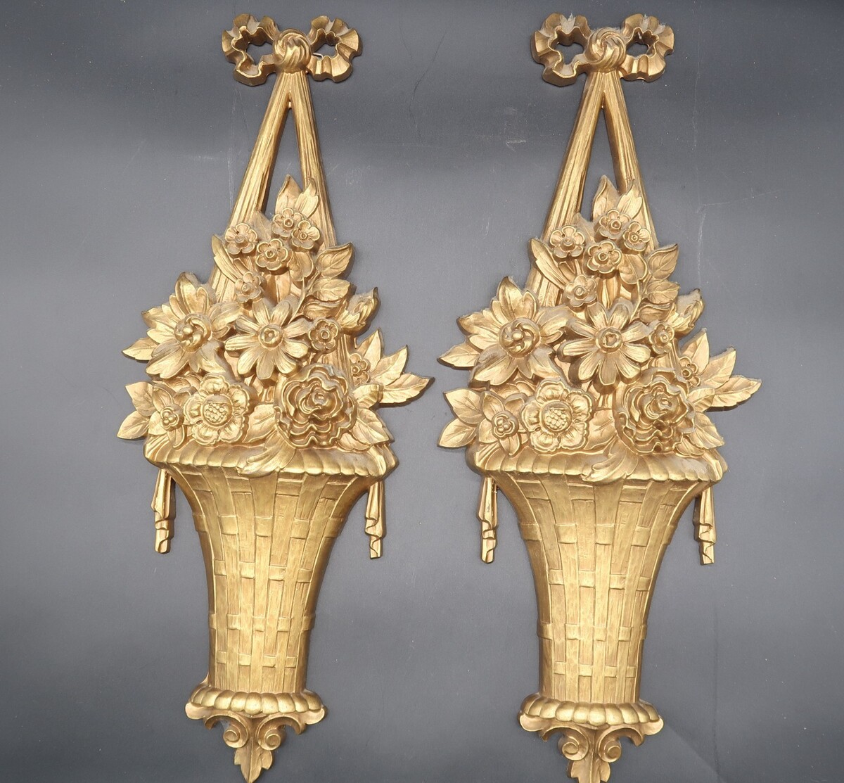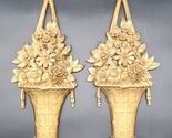 - Vtg Pair Syroco Wall Plaques Basket with Flowers Bows Gold 20" USA 1964
