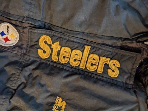 A vendre est un vintage propre d'occasion Pittsburgh Steelers Starter NFL Pro Line Puffy Jacket Foot Locker Kids taille XL. Mesures: aisselle a aisselle : 22 pouces Epaule a ourlet : 25 pouces Epaule au poignet : 26 pouces