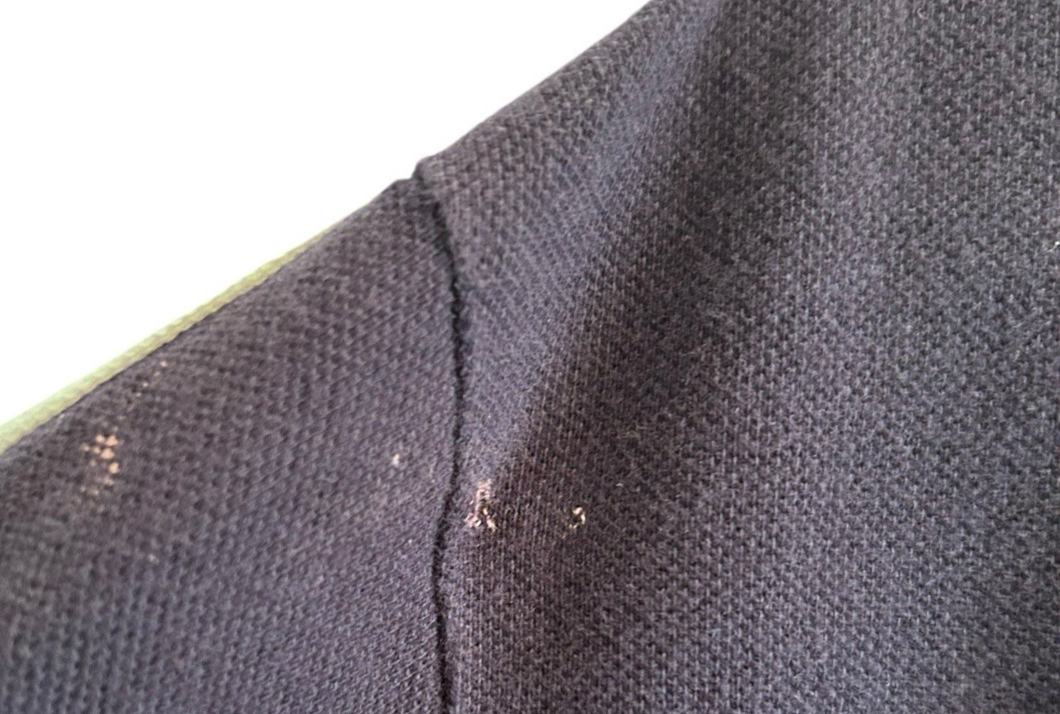 This has a teenie tiny hole right near the top part of the shoulder area near the square polo patch. SEE last photo. It is zoomed in so it looks way worse than it is when wearing. Please be ok with this before buying.