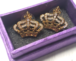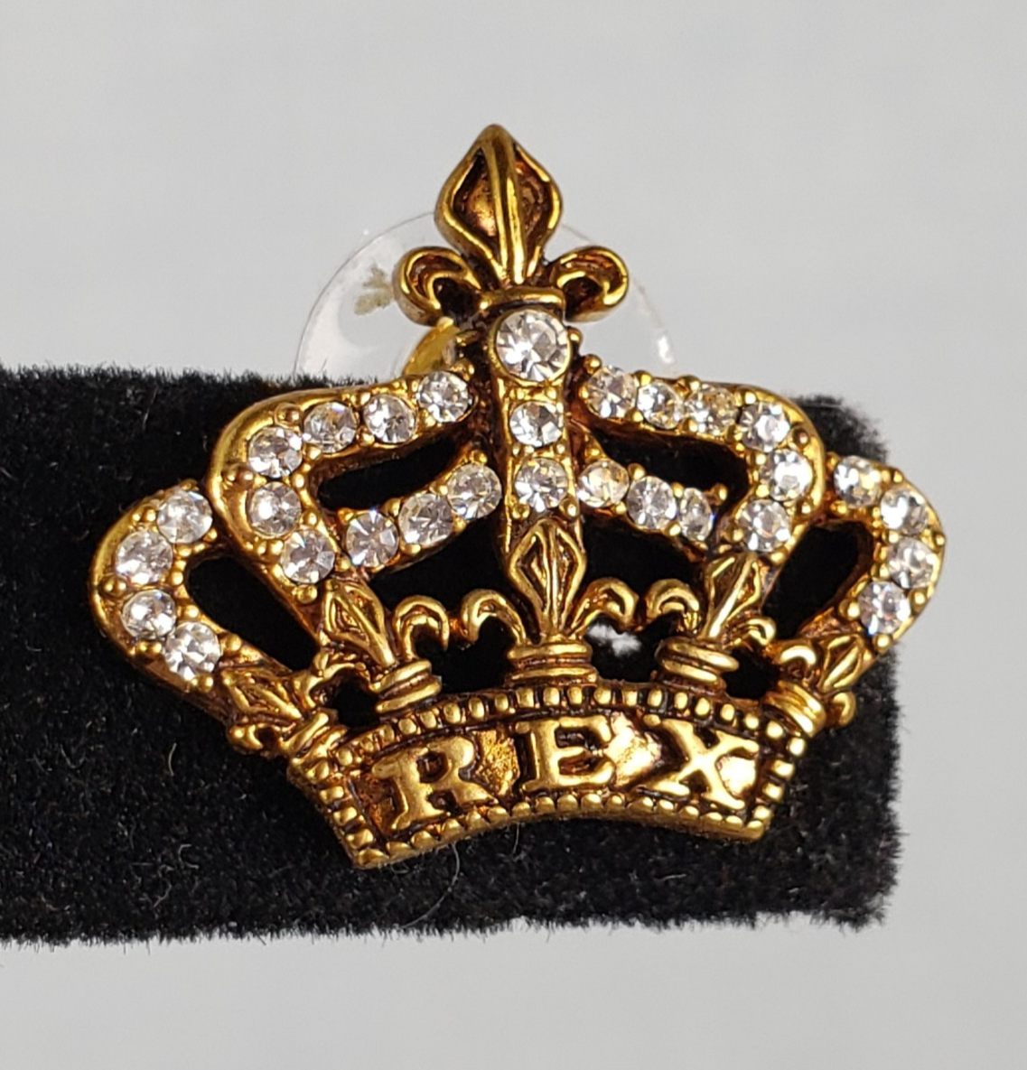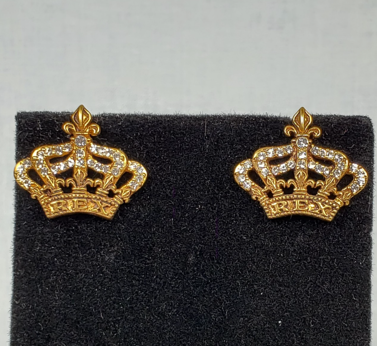 - Vtg RARE New Orleans REX Mardi Gras Krewe Crystal Crown Gold Tone Earrings w/Box