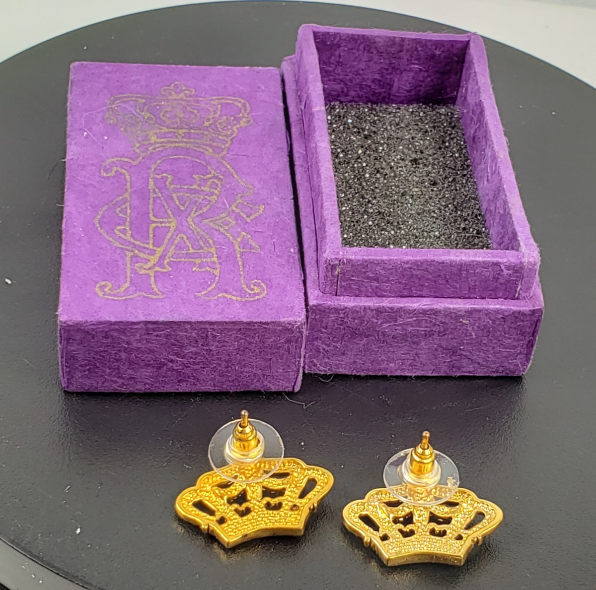 Vintage RARE New Orleans REX Mardie Gras Krewe Club Crystal Crown Gold Tone Earrings with Box