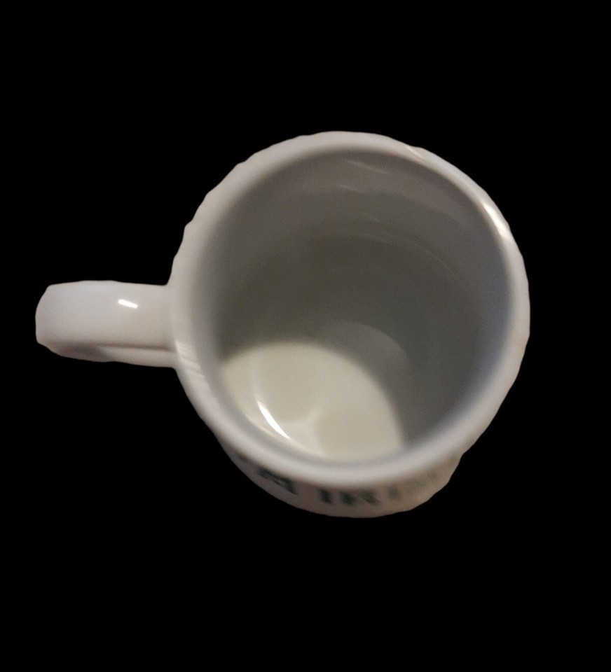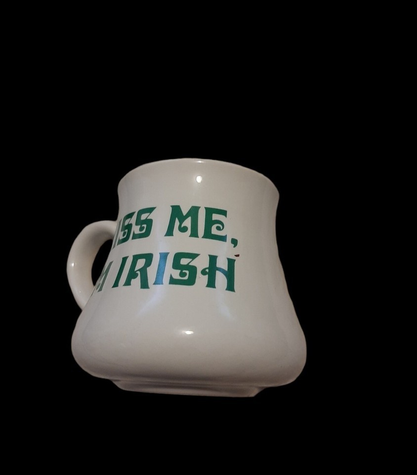 Vintage mug made by Russ Berrie- Blonde haired leprechaun - One side has a leprechaun, the other says "KISS ME I'M IRISH" in green - Unique mug shape - There's a barely noticeable scratch above the Letter "H" - St. Patrick's Day mug - Irish mug ? Mug height: 3.5 inches ? Mug diameter: 3 inches