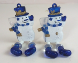 Vtg Set of 2 Snowmen Dangling Leg Wearing Blue Holding Broom Glittery Ornaments