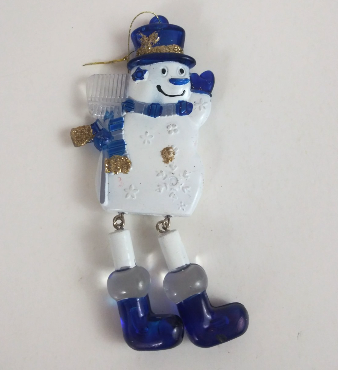 - Vtg Set of 2 Snowmen Dangling Leg Wearing Blue Holding Broom Glittery Ornaments