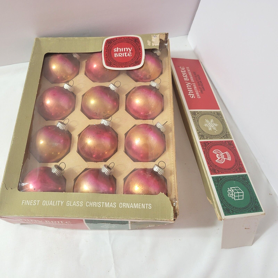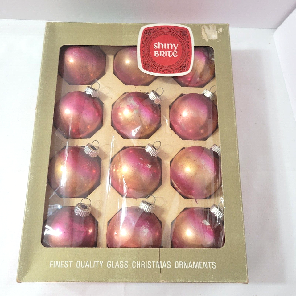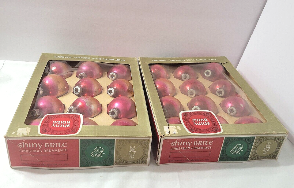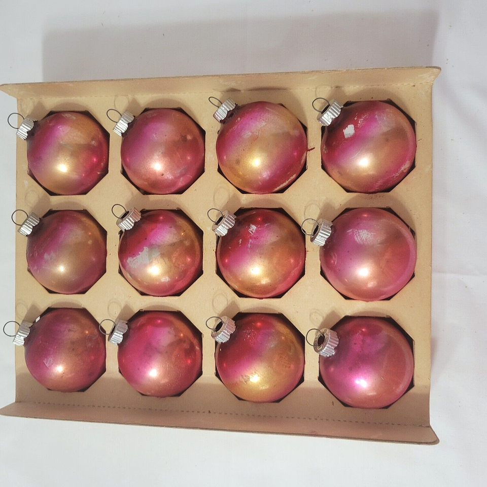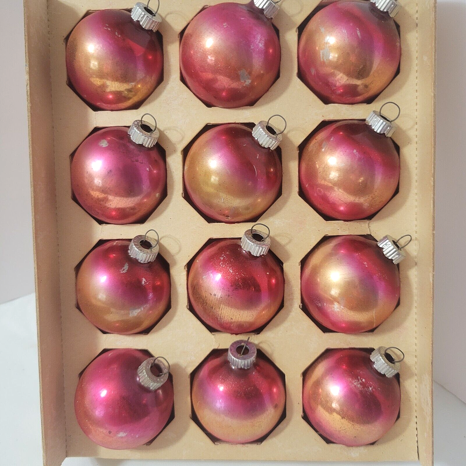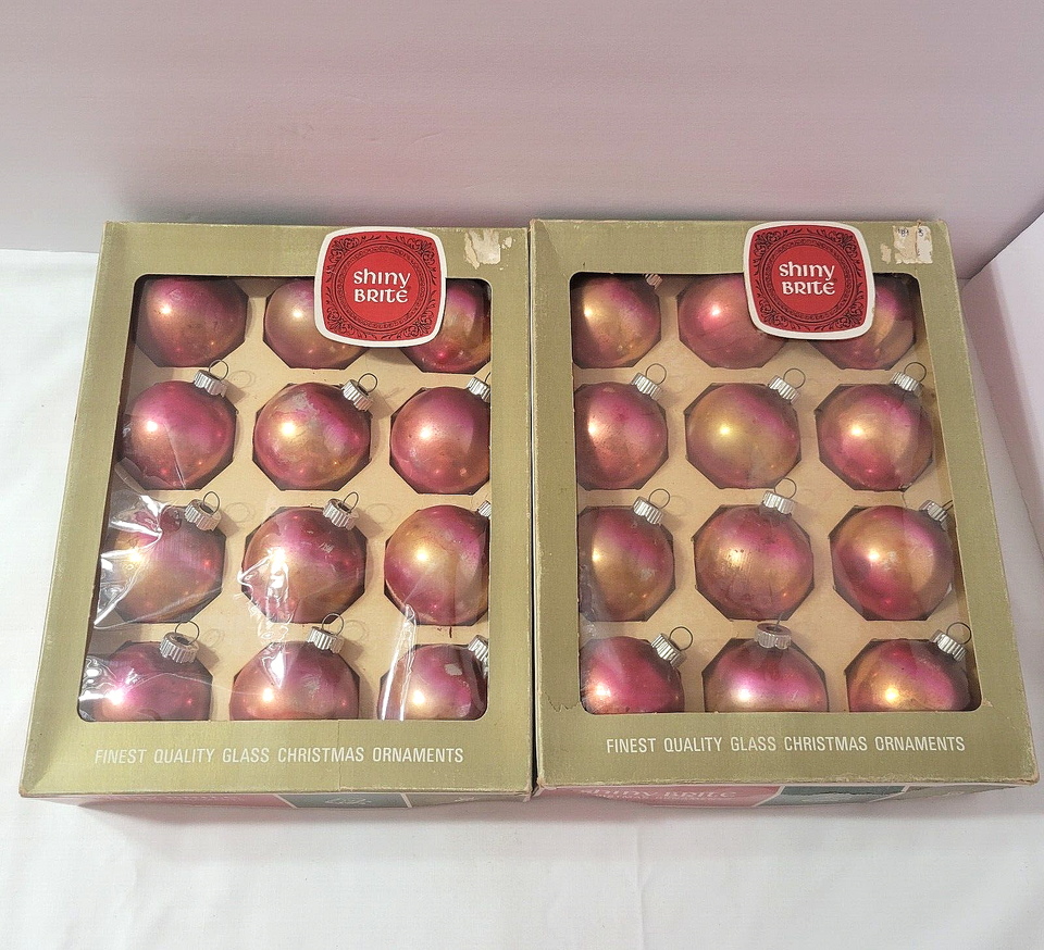 - Vtg SHINY BRITE Lot 24 Christmas Ornaments Ombre PINK GOLD in Box Silvered Glass