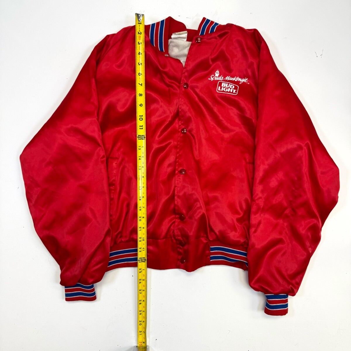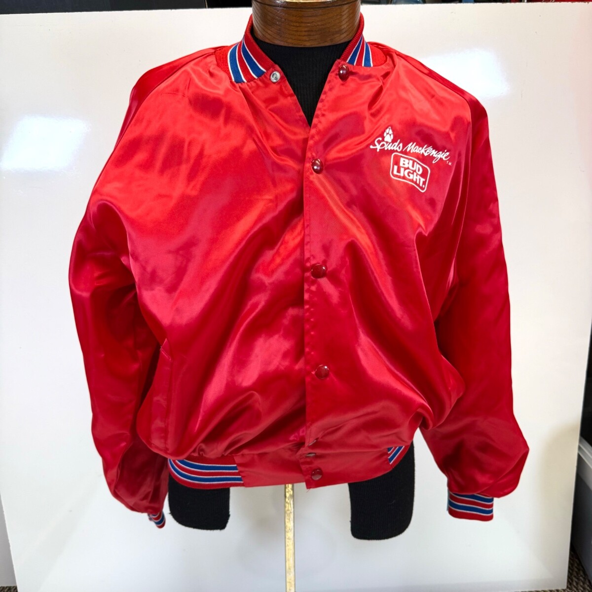 Vtg Spuds Mackenzie Bud Light Satin Jacket Mens Sz XL Anheuser Busch 80s Promo. Overall good condition on this vintage satin jacket. It does have some smaller dark spots on the back that I did not try to wash. I will leave that to the buyer. Great made in USA jacket featuring an iconic advertising icon. Please see all photos. Photos include measurements for armpit to armpit and for top of shoulder to bottom of jacket.