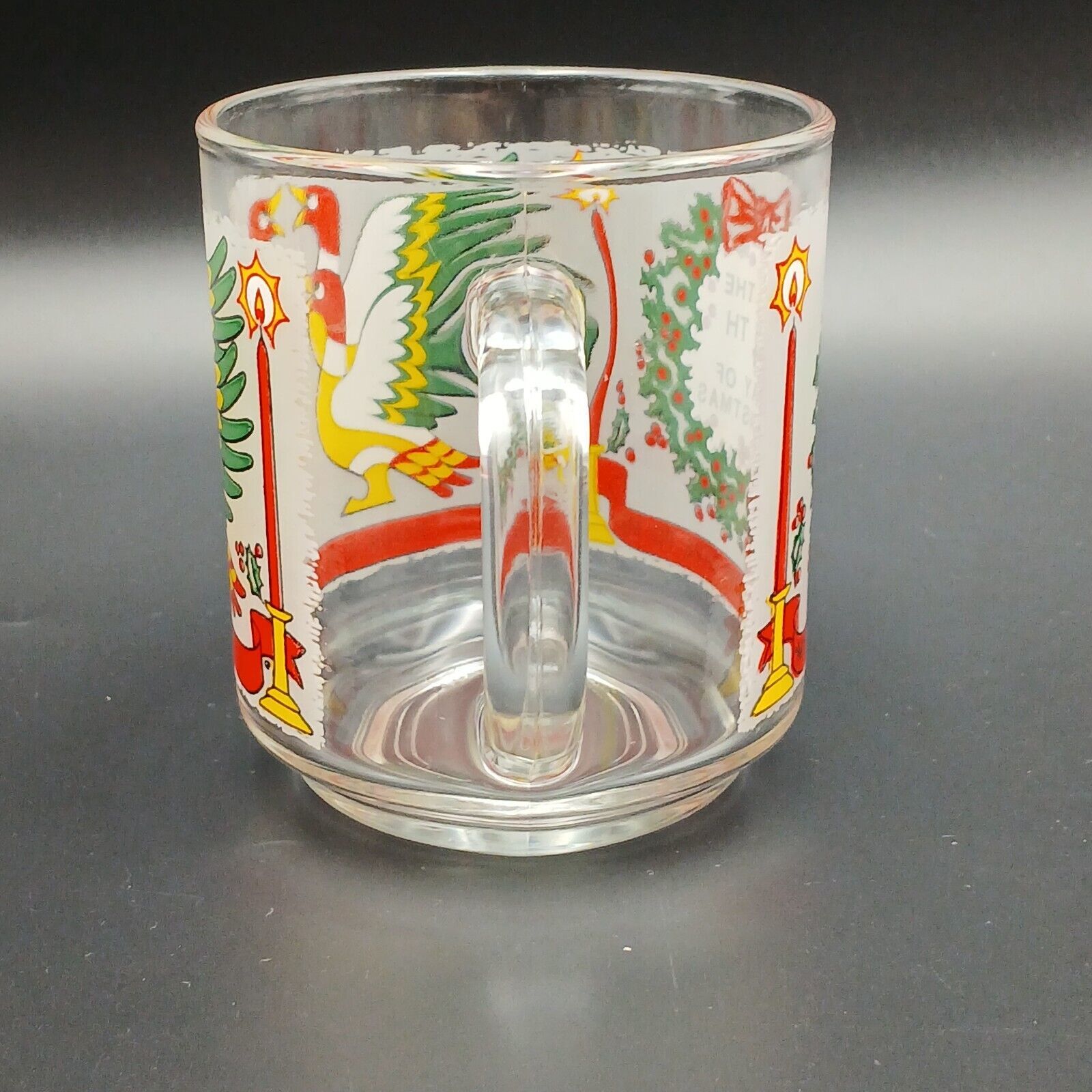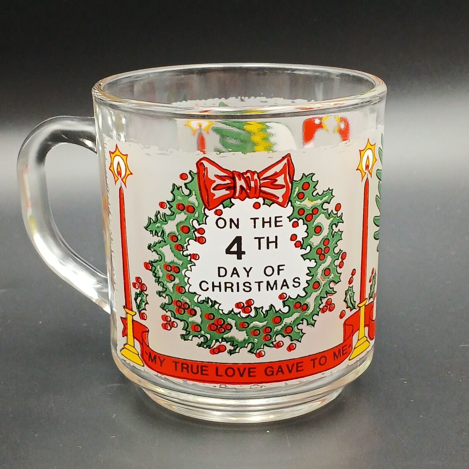 This vintage glass mug tumbler features the classic "Twelve Days of Christmas" design, with the fourth day featuring a calling bird. The multicolor mug is made of high-quality glass and is perfect for collecting or for enjoying your favorite beverage during the holiday season. It is a great addition to any Christmas decor and is sure to bring joy to your home.