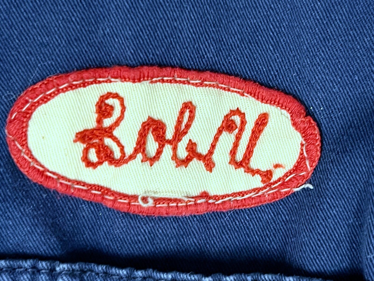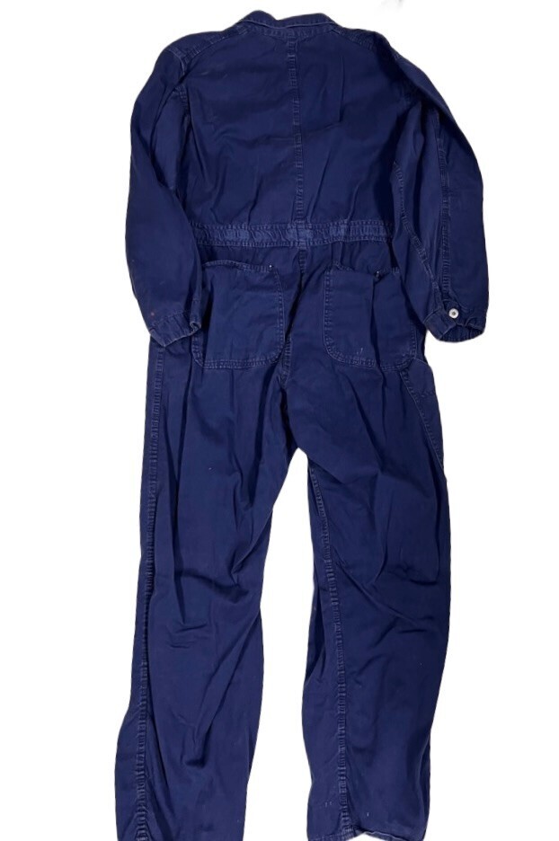 Get that authentic workwear look with these killer vintage 1940s Universal Overall Company coveralls! These are the real deal, in a classic "Stone Cutters Blue" 100% cotton, and featuring a button fly and front closure. The best part? The "Bob" name patch on the chest adds some serious street cred and a one-of-a-kind vibe. These coveralls are in excellent shape and ready to be worn, making them a sustainable and durable choice for your style.