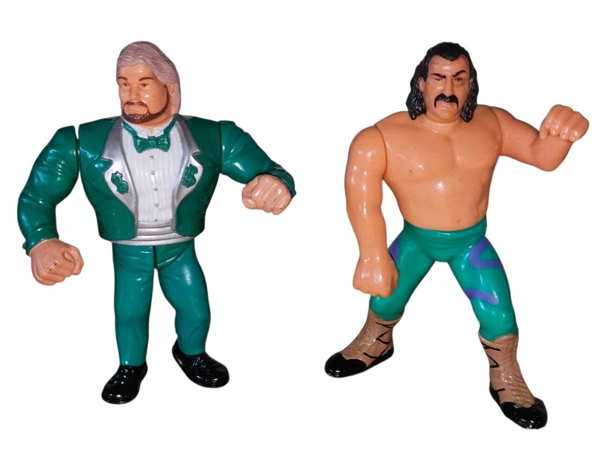The product is a set of vintage WWF Million Dollar Man and Jake The Snake action figures from 1991 by Hasbro under the Titan Sports franchise. These 4-inch plastic figures are part of the wrestling theme and are considered first edition collectibles. The characters are part of the WWE family, representing Million Dollar Man and Jake the Snake in their wrestling personas. Made in 1991, these multicolored figures are a must-have for fans of 80s and 90s wrestling memorabilia.