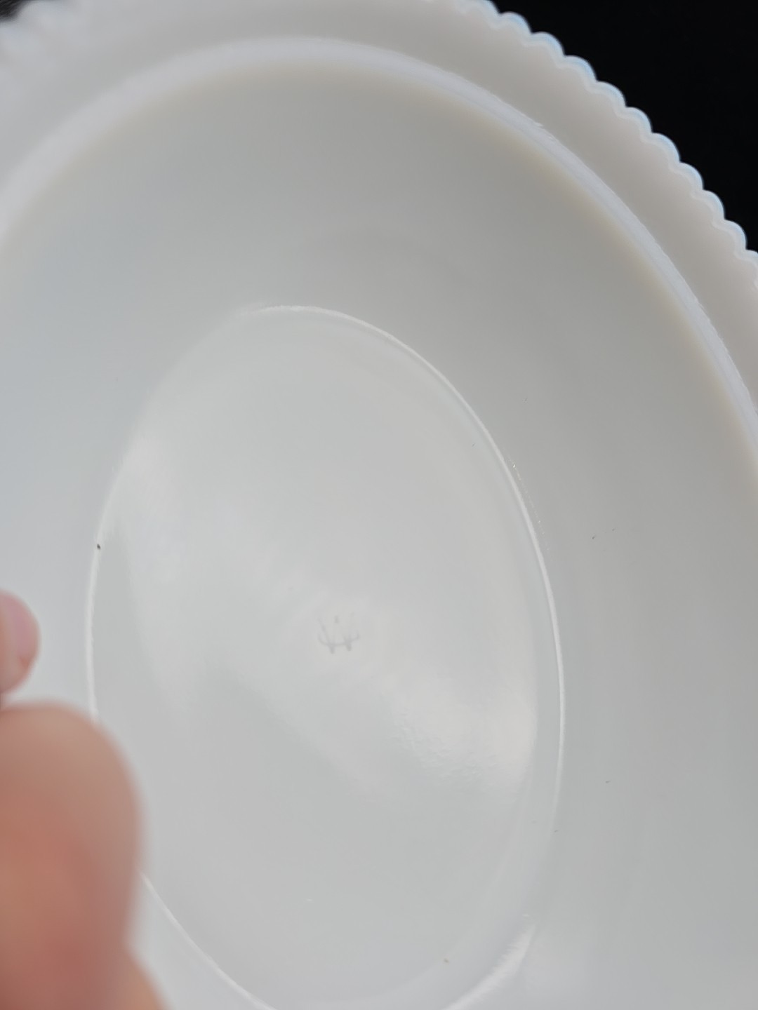 See pictures. It has a spot with 3 minor chips on the inside of the base. These are noted by my finger.