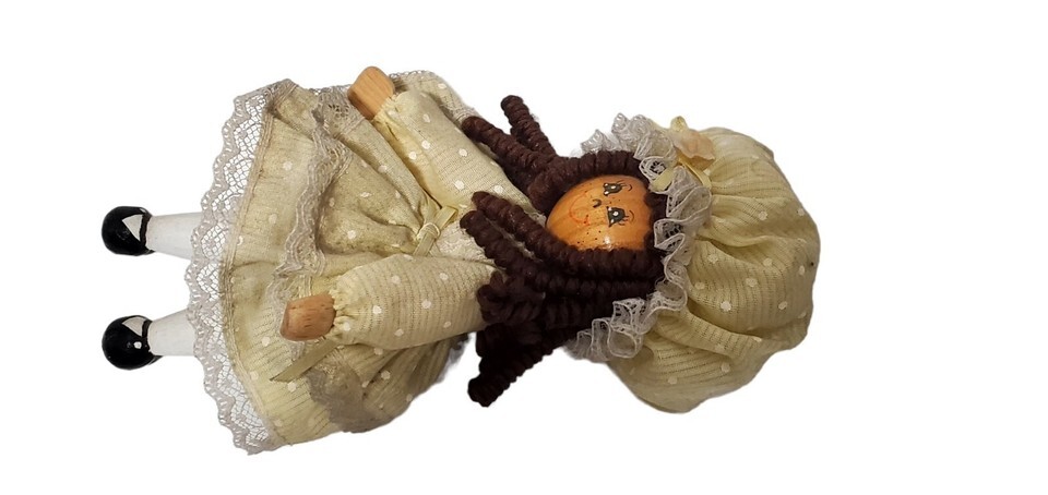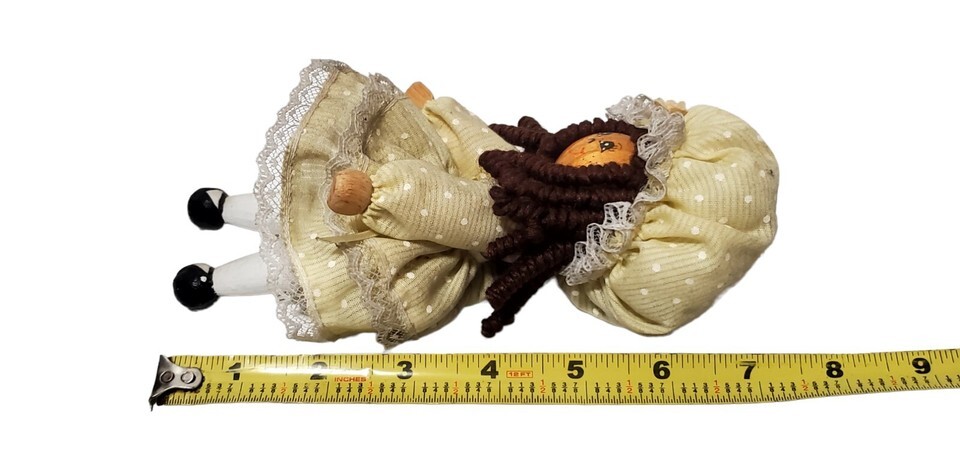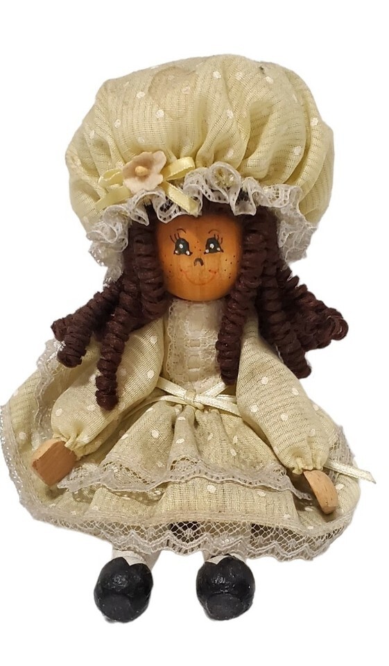 - Vtg Wooden Clothespin Doll Prairie Bonnet Yellow Polka Dot Dress Curly Brown