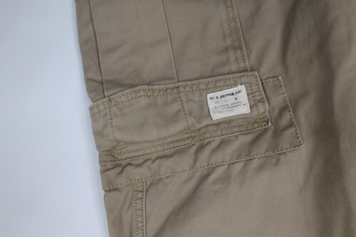 Blemishes front of legs, back left leg. Cuffs, inner lining discolored. Color faded. Pilling. Loose threads pockets