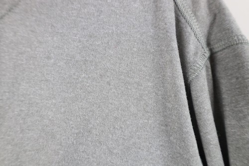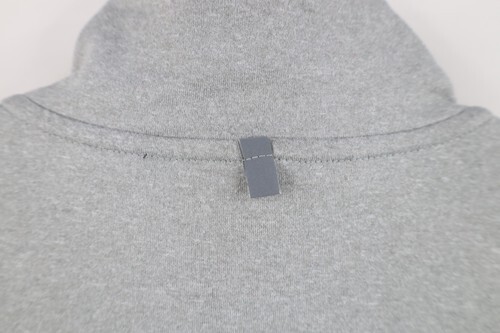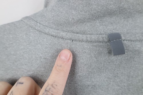Dark spots front, back. Pin hole back of collar. Collar, cuffs discolored. Color faded. Pilling. Some graphics reflective. Tag faded