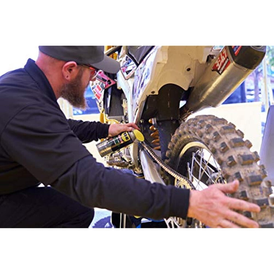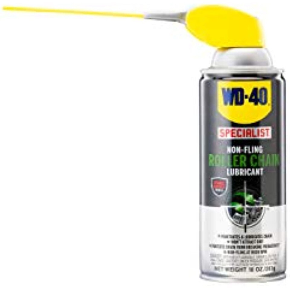 A ceramic-reinforced lubricant penetrants deep into the chain and protects the chain from breaking prematurely*. WD-40 Specialist Roller Chain Non-Fling Lubricant sprays on thin to penetrate deep into roller chains, inner chain links, pins and bushings, and then thickens to provide long-lasting lubrication, even with chains operating at a high RPMs. By penetrating deep into crevices, this formula helps protect the chain from rust and breakage. This roller chain lube?s ceramic-reinforced formula repels dirt and helps keep the lubricant from flinging off the chain during use. Safe on metals, chains, sprockets, chain links and O-Ring chains. *based on proper chain maintenance extending the life of a chain. Proper maintenance for roller chain is cleaning and lubricating not only the external parts (chain and sprockets) but also the internal parts (chain links) of the chain. * Ceramic Reinforced Formula * Penetrates deep and thickens to provide long-lasting protection * Non-Fling at high RPM * Prevents chains from premature breaking * Safe on O-Ring chains * 50-state VOC compliant