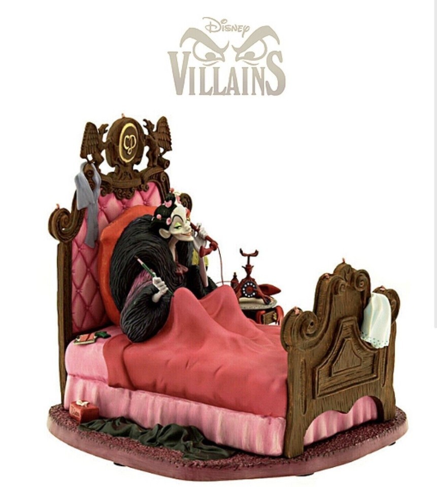 Inspired by her in the {1961} 101 dalmatians. Hand painted porcelain figurine of Cruella De Vil. She has bronze arms and cigarette, pewter bedside table, resin head and foot board.