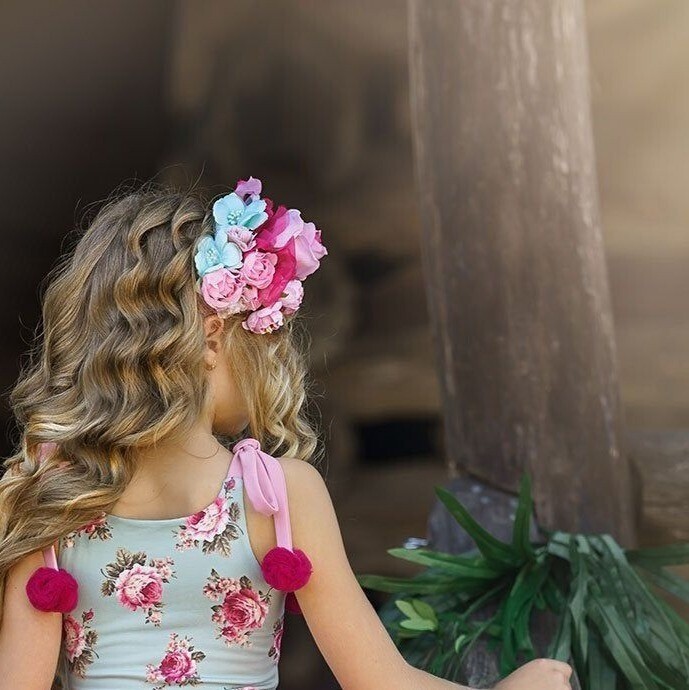 Our Waiting On Wild Flowers Rose Headband features an abundance of perfectly paired flowers and roses on a pink lace tie. This can be worn as a headband as shown in the images, or around the waist as a sash.
