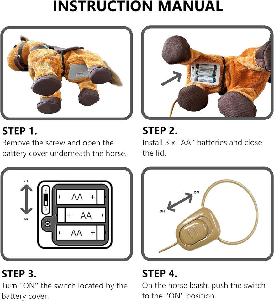 ? Battery-Operated for Simple Use: Powered by 3 x 1.5V ?AA? size batteries (not included). The battery compartment and ON/OFF switch are conveniently located underneath the horse for hassle-free operation.