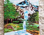 You are considering a completed paint-by-number landscape with mountains, pine trees, a waterfall and a grazing deer or elk. Canvas mounted on wood frame, about 9? by 12?. Very good condition; Smoke-free home.