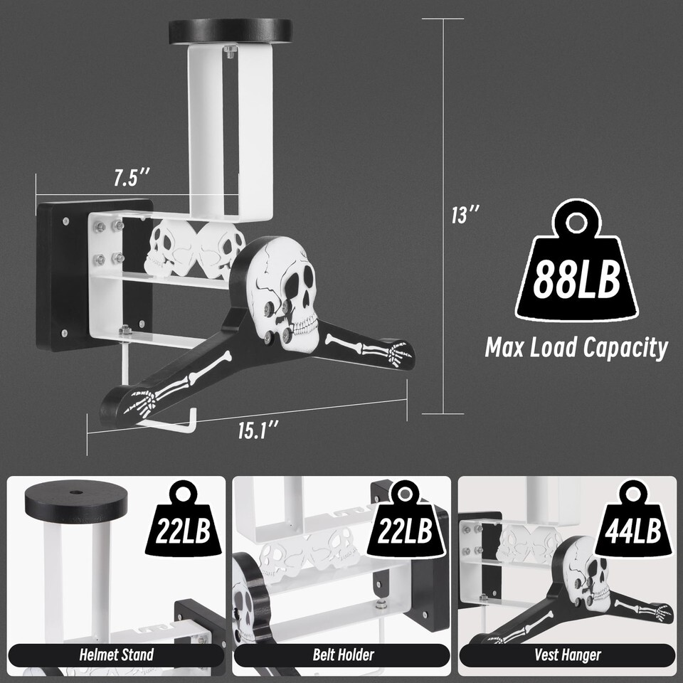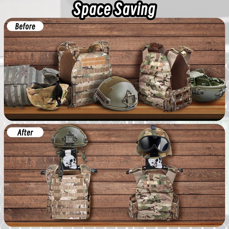 ?Heavy Duty Load Capacity?Tactical Helmet Wall Mount Can Hold Up To 88lbs, Making It A Sturdy And Reliable Storage Solution For Your Motorcycle Tactical Gear. It Has A Helmet Rack Capacity Of 22lbs, Vest Hanger Rack Capacity Of 44lbs, And Belt Rack Capacity Of 22lbs