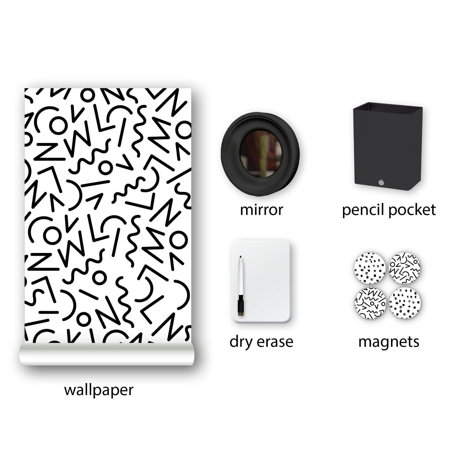 Fun, contemporary style; Stay stylish with a 12-in x 36-in sheet of non-stick wallpaper; Stay on track with a 5-in x 7-in dry erase board with a magnetic back; Always look fabulous with a 7-in x 7-in magnetic mirror; Complete with a 3-in x 4-in x 2-in magnetic pencil box; Includes four magnets.
