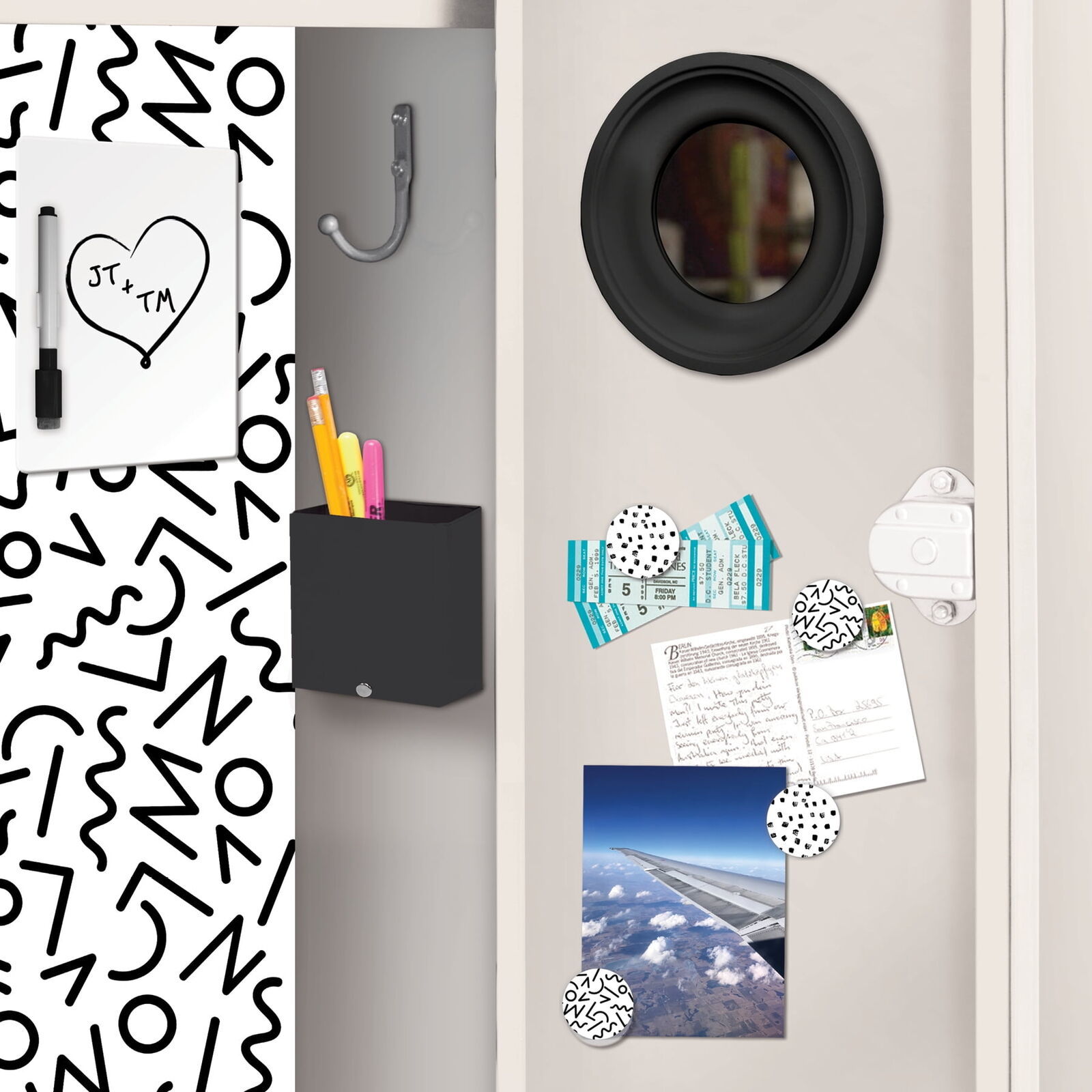 Give your locker a fun and contemporary flair with this black and white decorating kit. With all the necessities from a funky wallpaper, to matching magnets, to a dry erase board and a black mirror and pencil pocket, you'll be organized and fashionable all year round. Measures 34.25-in long x 9.825-in wide x 18-in deep when assembled.