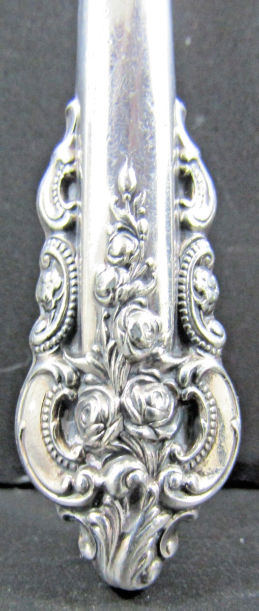 Grande Baroque sterling silver flatware pattern by Wallace Silversmiths. This highly ornate pattern, featuring intricate carvings of flowers and acanthus leaves inspired by the Renaissance, was first introduced in 1941 and has since become a very popular sterling silver design.