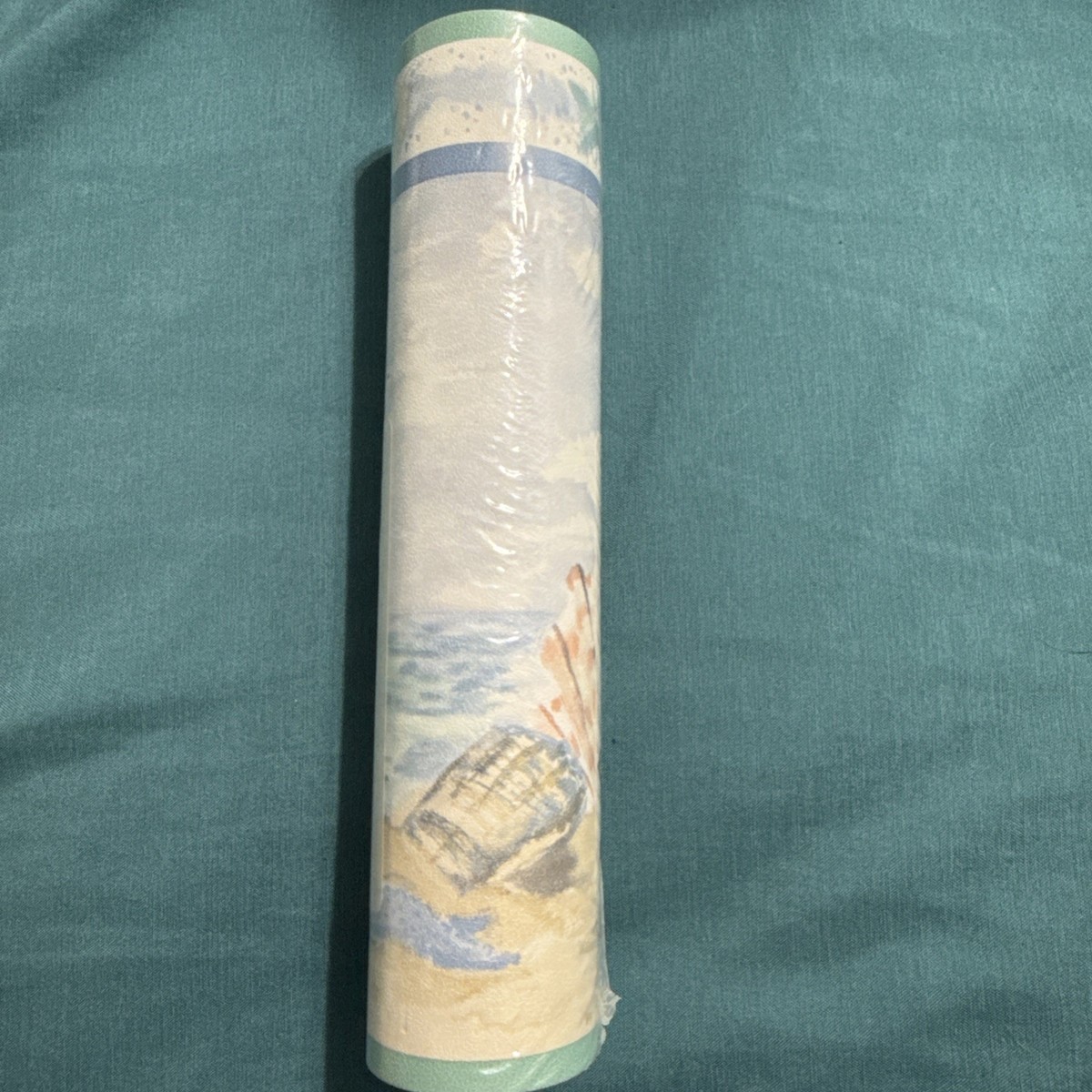 This listing is for one sealed roll of The Fashion Point wallpaper border featuring a serene beach scene with a chair and soft ocean tones. The roll remains in the original factory plastic, and the label is intact. The design is ideal for coastal decor, bathrooms, craft projects, or vintage wallpaper collectors.