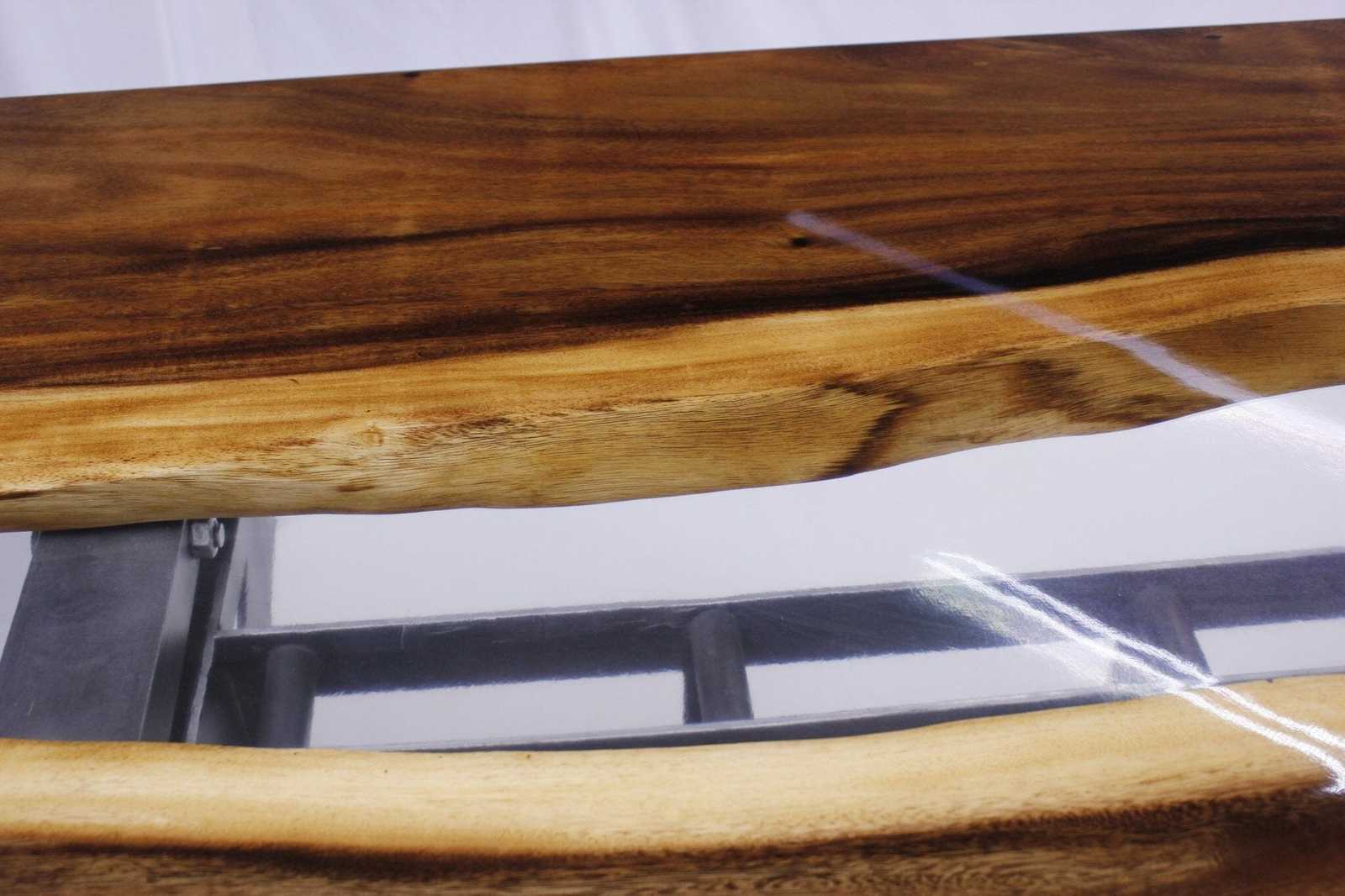 - Solid clear epoxy river between two live-edge solid walnut slabs