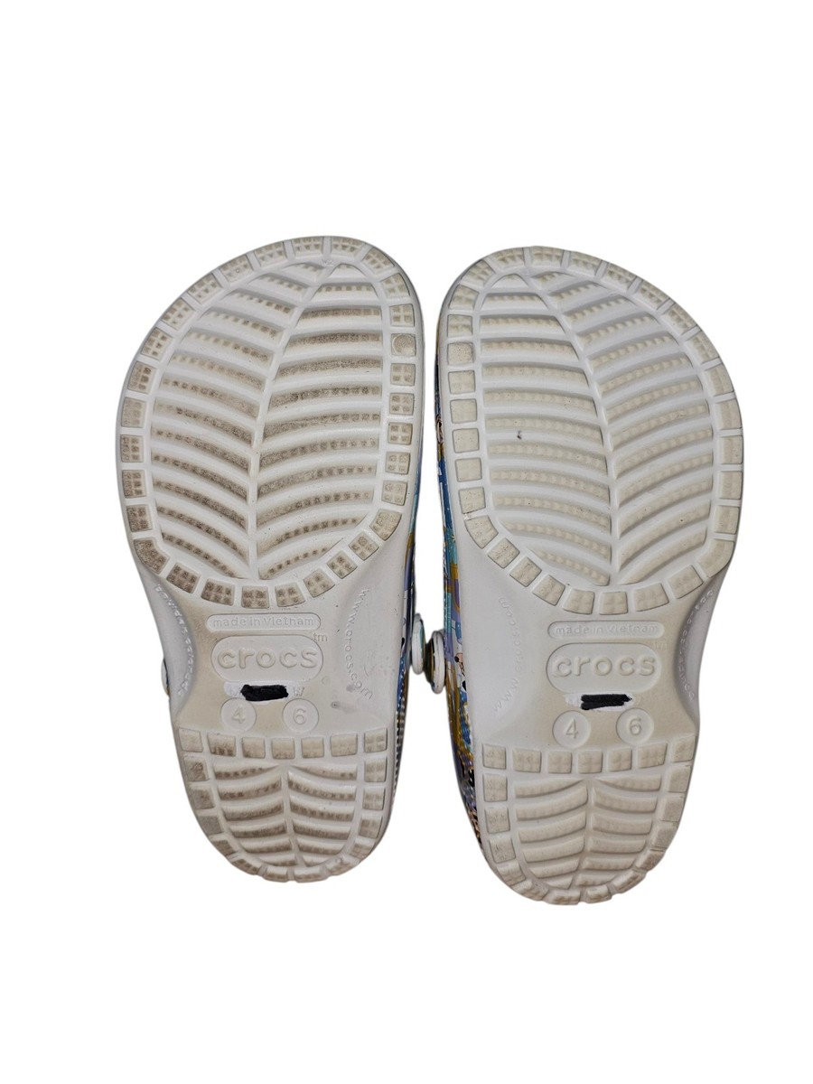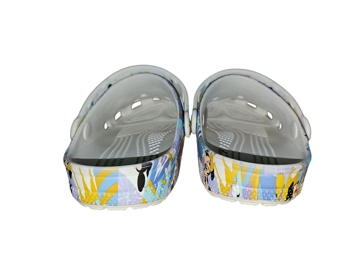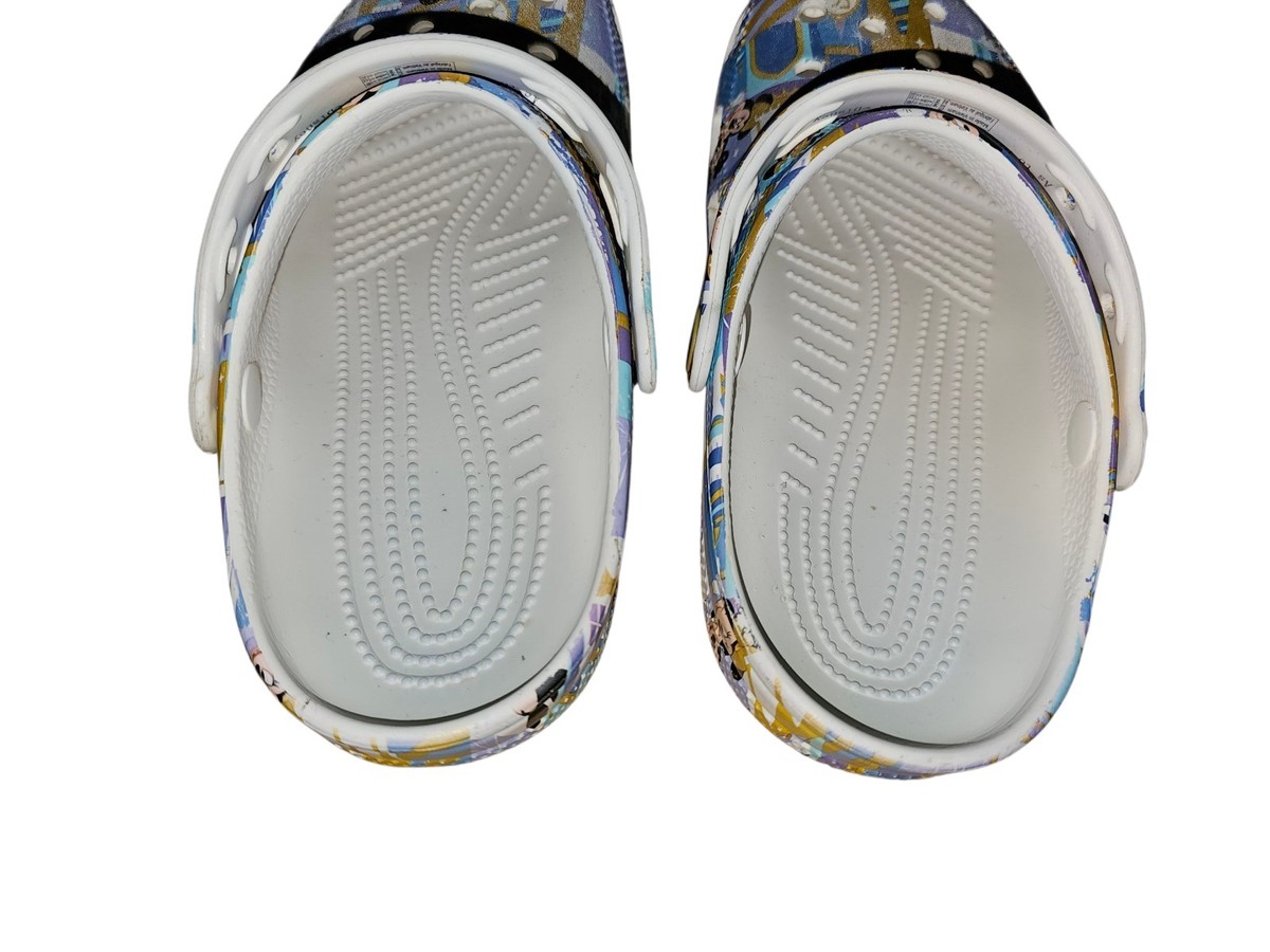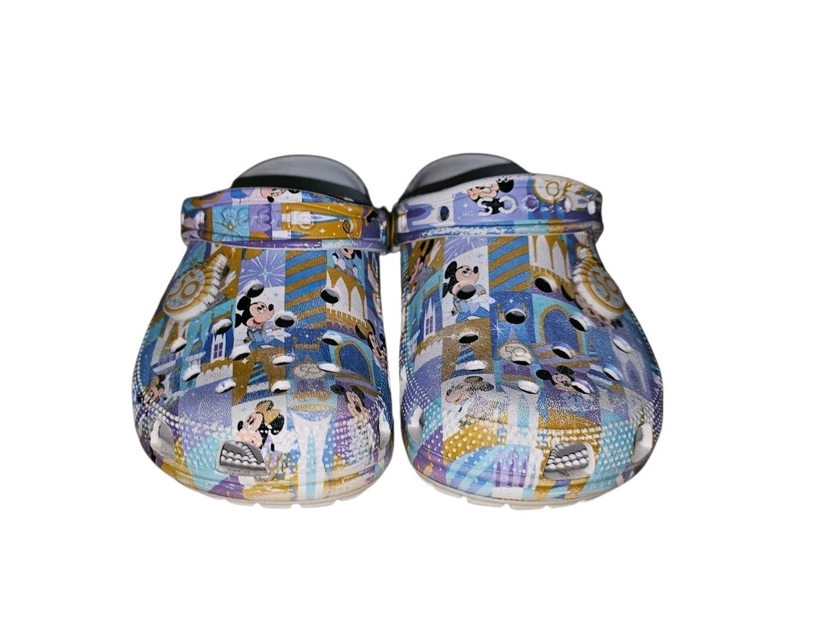 Celebrate the 50th anniversary of Walt Disney World with these Mickey and Minnie Mouse Adult Crocs in size M4/W6. These slip-on clogs feature a low heel height, rubber outsole, and geometric pattern in a colorful multicolor design. Perfect for travel, activewear, or casual occasions, these comfortable and stylish sandals are suitable for both men and women. Show off your love for Disney with this iconic pair of Crocs themed after the beloved Mickey and Minnie characters.