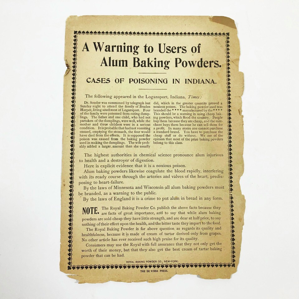 One side has an ad warning to users of Alum Baking Powders "Cases of Poisoning in Indiana"