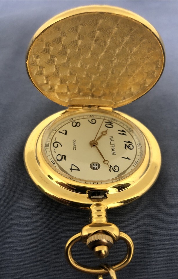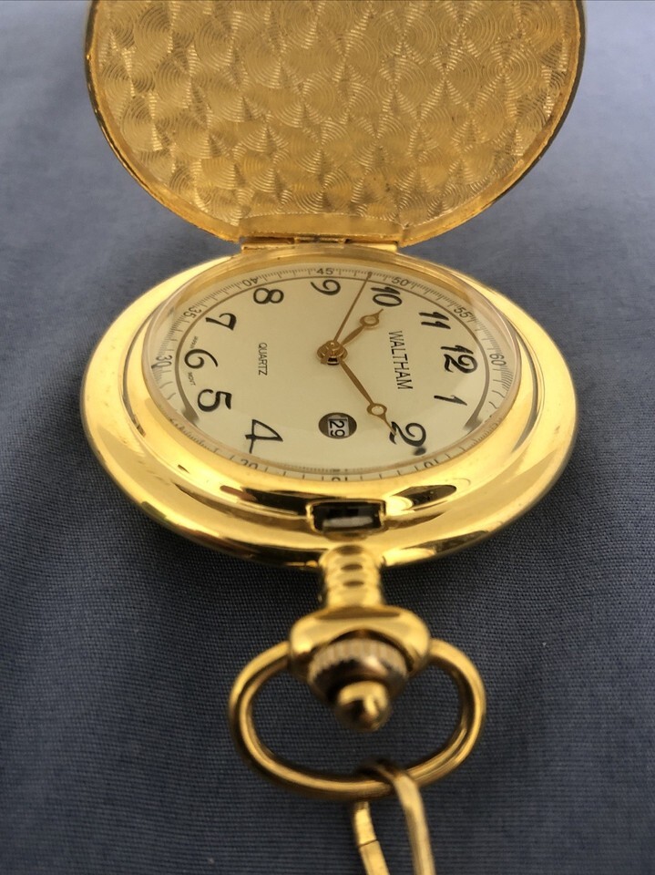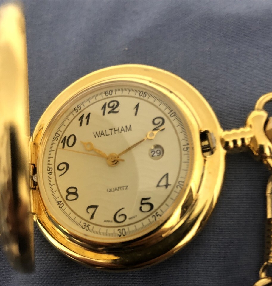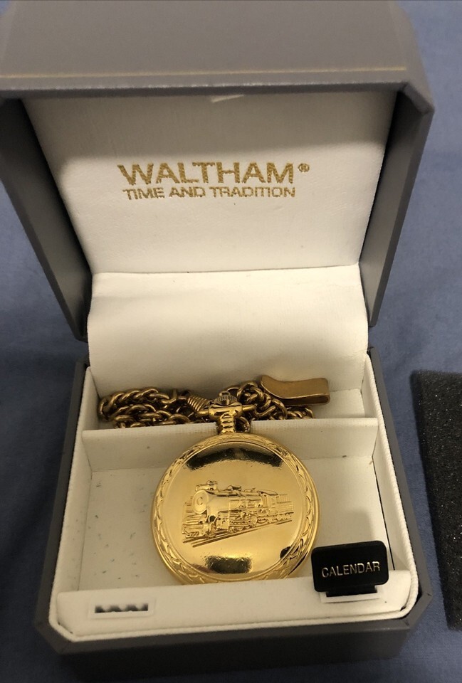 - Waltham locomotive train engraving pocket watch witch calendar feature