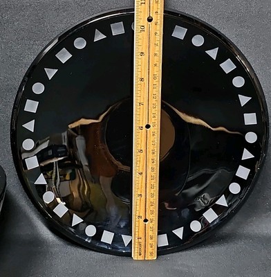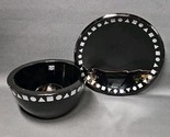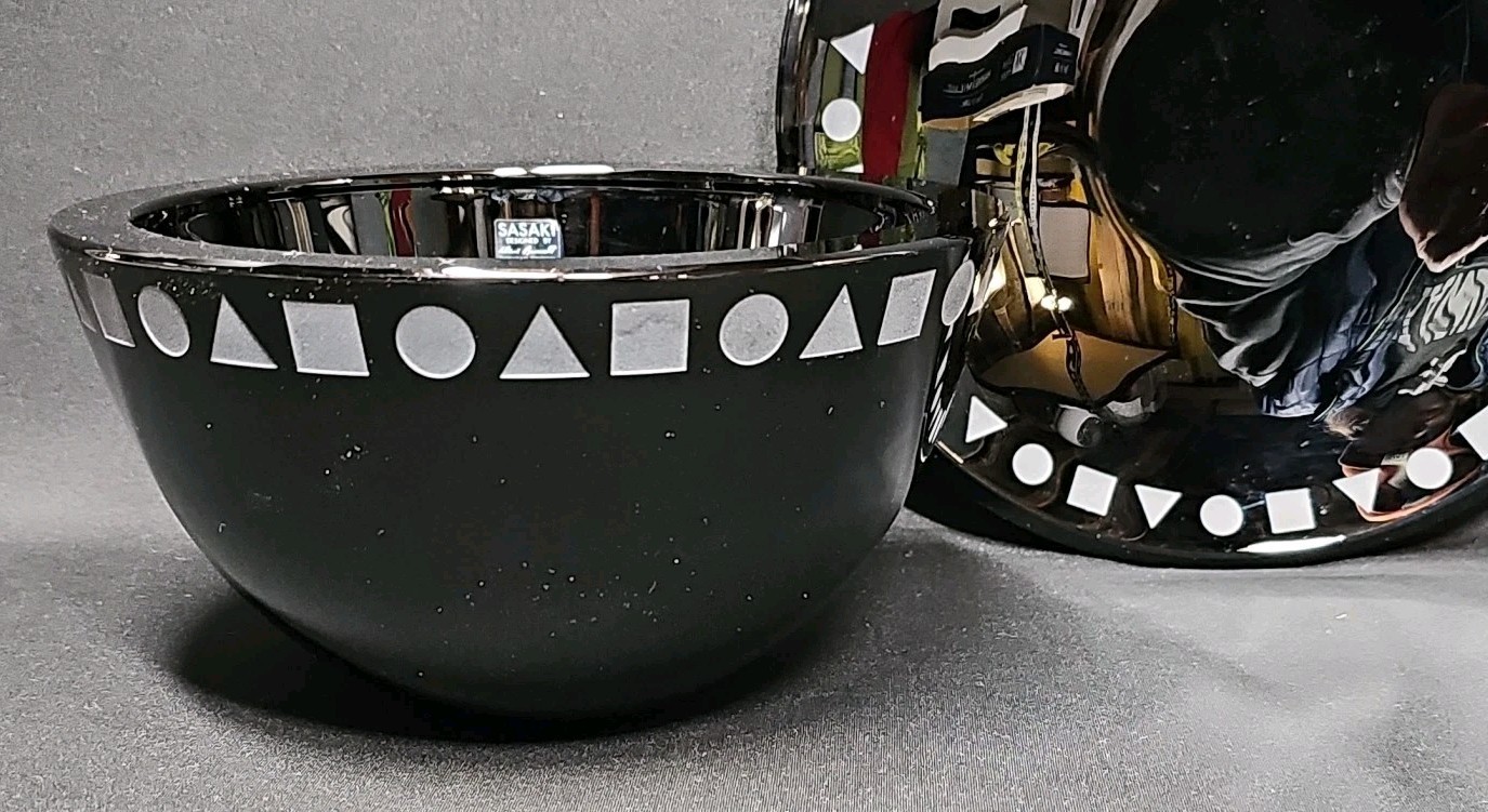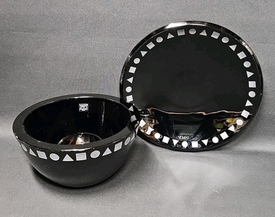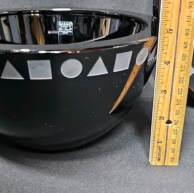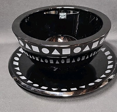 Striking mid-century modern design by Ward Bennett for Sasaki. This handcrafted crystal bowl and plate set features rich black amethyst glass with a bold white geometric band around the rim.