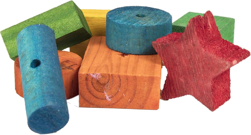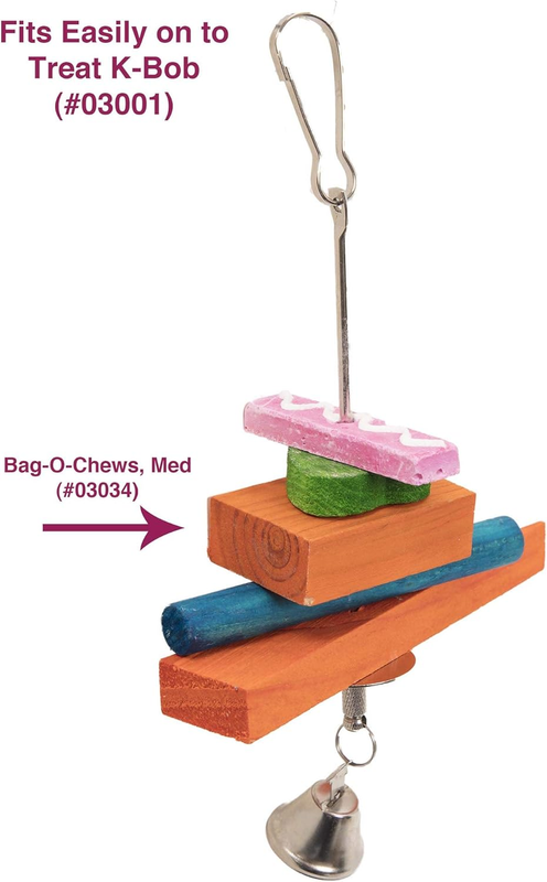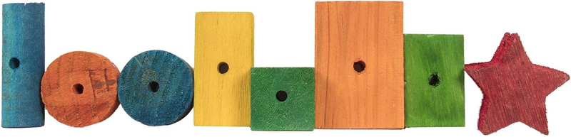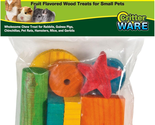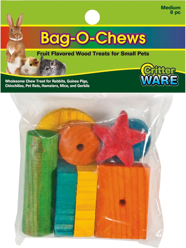 This wood chews are safe, natural and fun treats for small pets. They are made of pine with an enticing fruit flavor. Chew treats keep teeth trimmed and provide a fun activity that relieves cage boredom. Fits treat-k-bob item 03001. Additional shapes available. Pre drilled to fit on treat-k-bob dispenser. Includes 12-piece per package and USDA approved food colors. Available in medium size. Measures 5-inch width by 1-1/4-inch depth by 7-1/2-inch height.