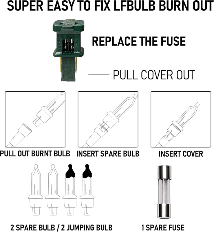 High Quality: The Christmas tree lights is IP 44 waterproof, build-in 3A fuse and pass with UL certified, is safety for both indoor and outdoor decorations. Each bulb works individual, others will work well when one bulb is defective. Just use the spare bulbs to replace the defective bulb.