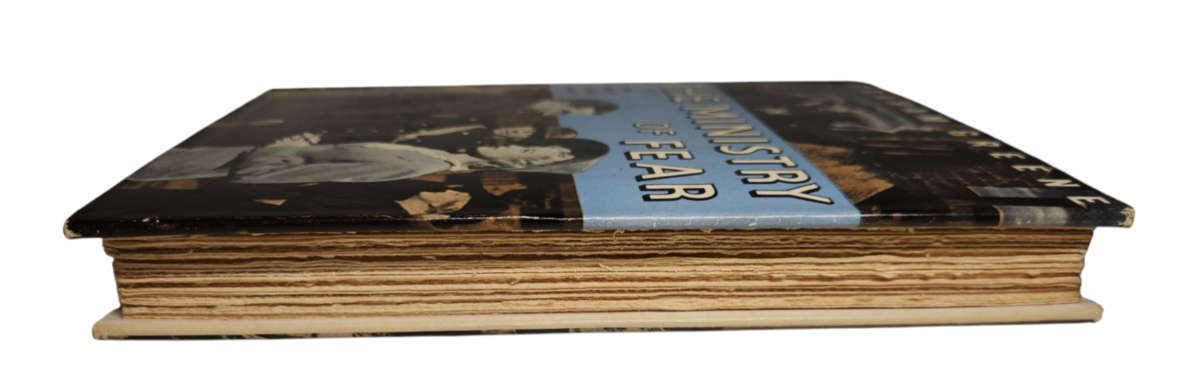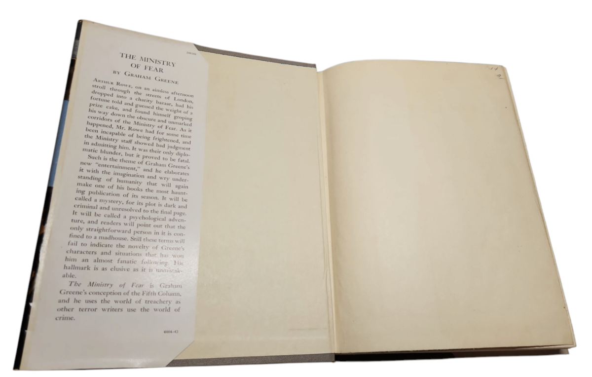 Graham Greene. The Ministry of Fear: An Entertainmant. Garden City: Sun Dial Press, 1944. Wartime motion picture edition. Octavo. 239pp. Publisher?s grey hardcover paper boards, stamped in blue to spine and front cover, original dust jacket.