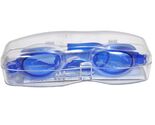 Package contains one pair of blue accented swimming goggles in a plastic storage case. Includes ear plugs.
