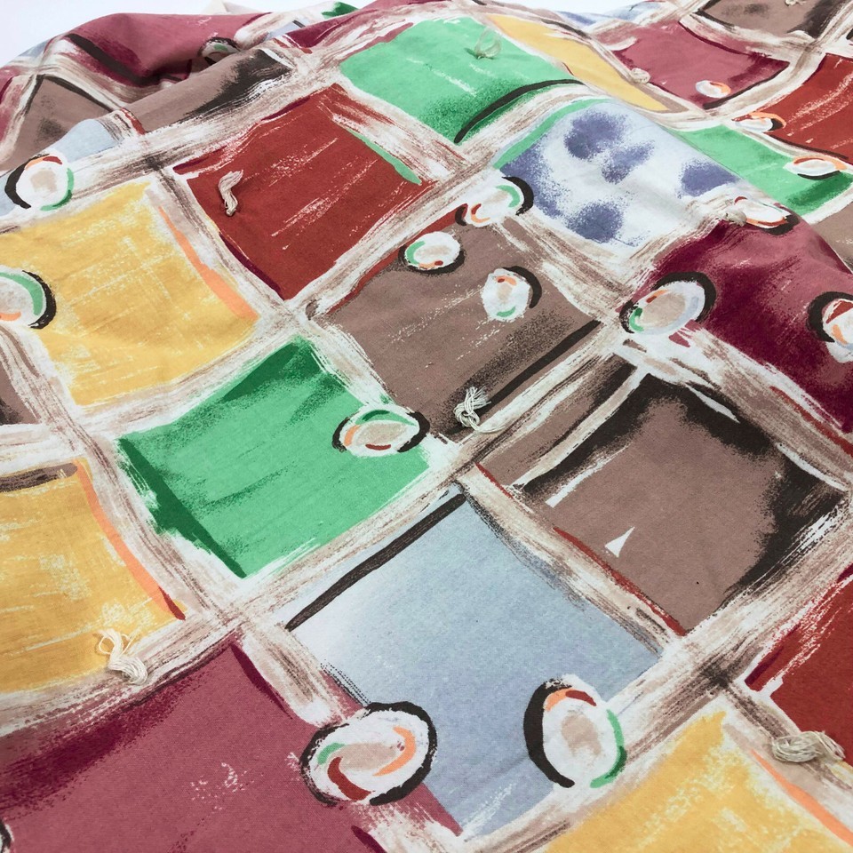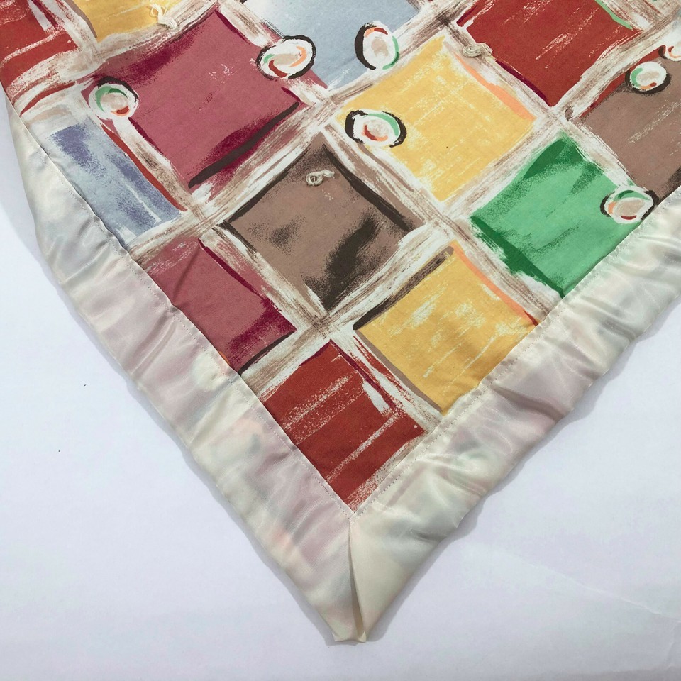 EUC. This beautiful watercolor lined throw has rectangles in colors of blues, green, brown, mauve, yellow, rust. There are ramdomly placed decorative accents of white tufts of threads. The throw's border is done in an ivory satin like material. The lining is in beige. The front also has randomly scattered circles in multi colors to accent the throw. You can decorate a sofa or even use this abstract design pretty throw as a wall hanging. No tags. May have been hand made. No rips, tears or stains.