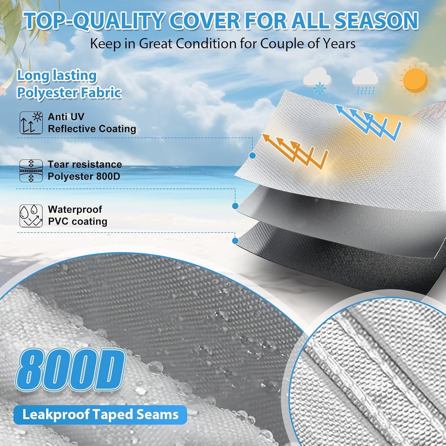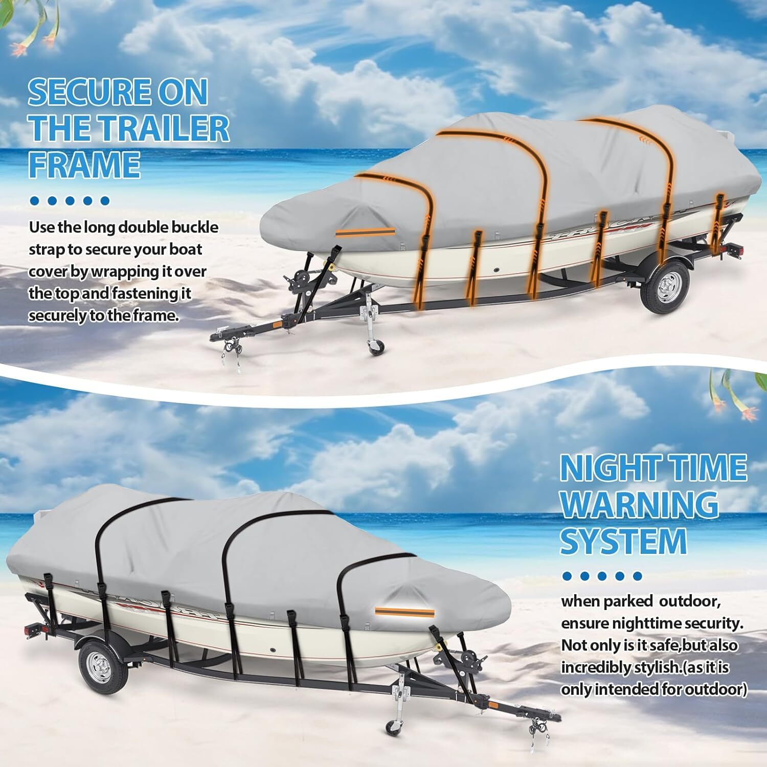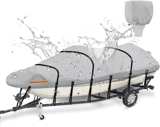 The heavy duty boat cover also features a double-stitched design and high-density seam technology, Backside waterproof seam sealing tape prevents water leaking.
