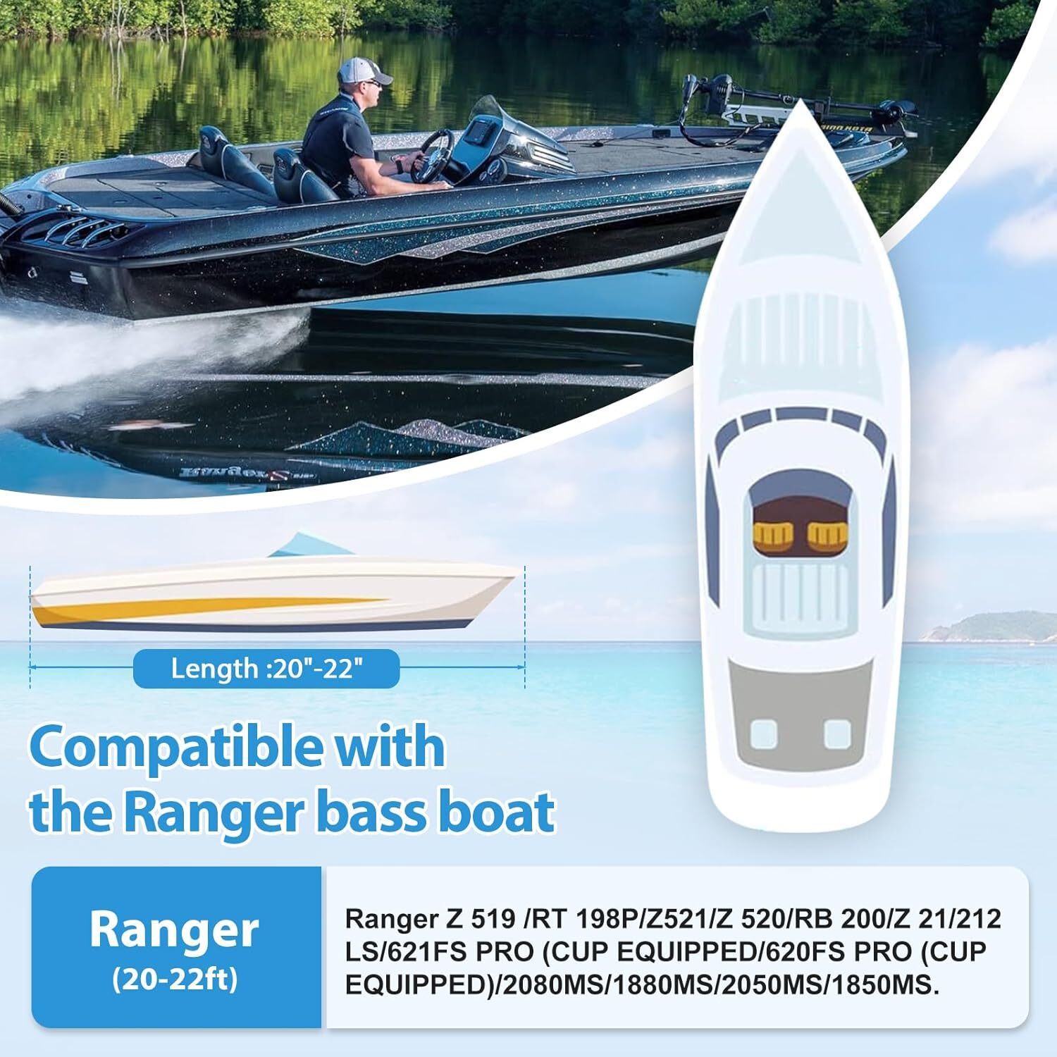Professional Fit: Our 800D boat cover is a perfect Compatible with Ranger Z 519 /RT 198P/Z521/Z 520/RB 200/Z 21/212 LS/621FS PRO (CUP EQUIPPED/620FS PRO (CUP EQUIPPED)/2080MS/1880MS/2050MS/1850MS.Protects your boat like a mobile garage. Heavy duty Material: Our boat cover is made of thick durable marine grade oxford cloth. We specifically thicken the fabric of bow and tail to reinforce stress points which can save the cover from sharp boat edge. All seam areas are double stitched, strong and tear-resistant, no raw edges. Upgraded Weatherproof: 4-Layer Thickened Fabric, made of 100% waterproof coating + marine grade 800D oxford fabric + Anti-UV coating + PU Coating. Maximum sun and heat protection to protect your bass boat cover (No fade problem). Water resistant to 5000mm, protect your bass boat from scratch, dust, rain, snow, and UV rays. Ideal for all-weather protection and long-term storage. Packed box includes: 1 boat cover, 1 storage bag, and 12 buckle straps. We have specifically upgraded and increased the storage bag so that it can be used both as a storage bag to store the boat cover and as a Motor Cover to protect your motor. It' s a cost-effective choice for you. No Worry Shopping: 30-day money-back with no questions asked. If there are any quality issues with the cover within two years, please CONTACT US first. We'll offer repair solutions or a replacement according to repairability. Note: When towing the boat with the boat cover covered, do not go too fast, otherwise the boat cover will be damaged (even the boat cover made of good fabric cannot withstand the impact of high-speed driving). It is recommended to use it in a stationary state.